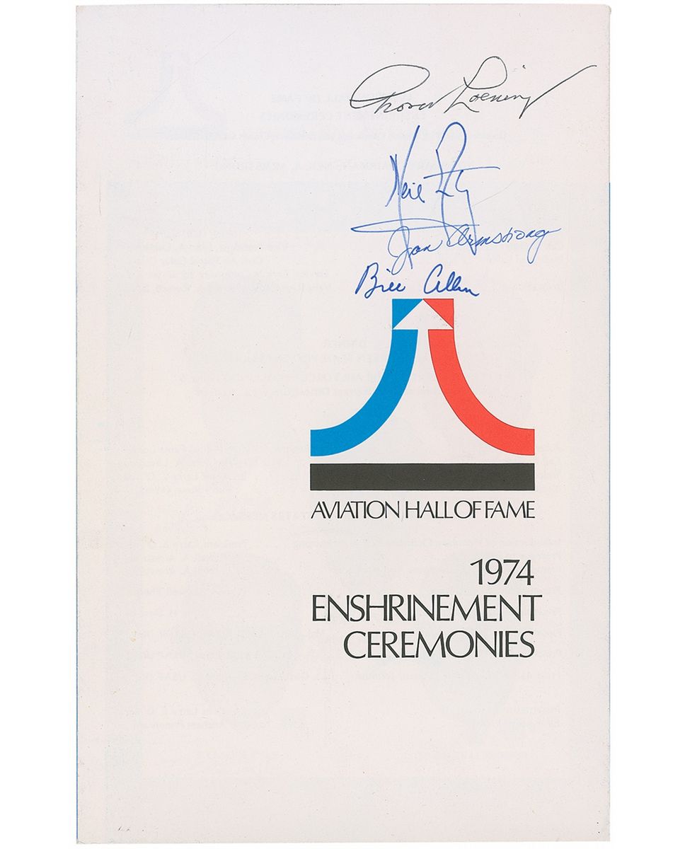 Program from the 1974 Aviation Hall of Fame enshrinement ceremonies, 7 x 11.25, signed on the cover in blue felt tip “Neil Armstrong.” The cover and interior pages have also been signed by Armstrong’s wife, Jan Armstrong, and several officials and inductees, including Bill Allen, Leigh Wade, C. R. Smith, John K. Northrup, and T. Claude Ryan. Mild handling wear, and Armstrong’s signature slightly touching his wife’s name, otherwise fine condition.
