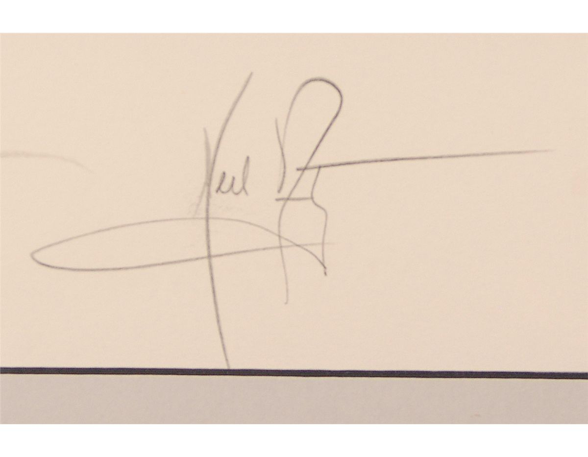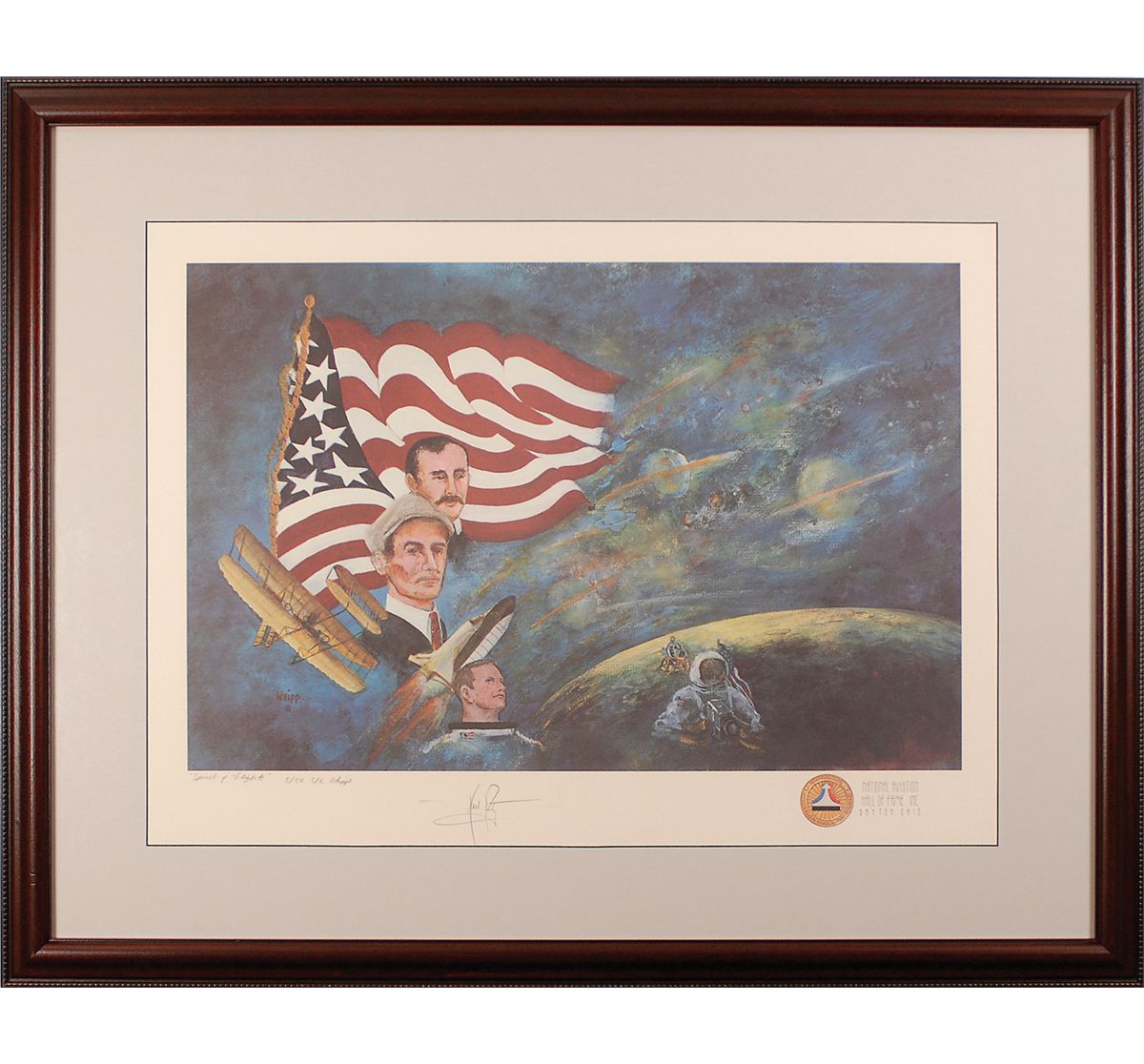 Color limited edition 24.75 x 18.25 lithograph entitled Spirit of Flight, created for the National Aviation Hall of Fame, numbered #5/50, signed in the lower border in pencil by Armstrong. Matted and framed to an overall size of 33.5 x 27. Also signed in pencil by the artist, S. E. Whipp. In fine condition. A highly desirable and seldom-offered lithograph. Oversized.