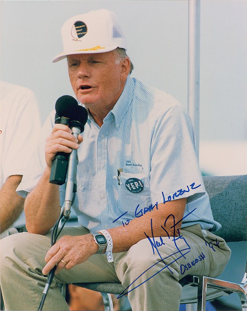 Unique candid color glossy 8 x 10 photo of Armstrong speaking at the 1994 Experimental Aircraft Association convention in Oshkosh, Wisconsin, signed and inscribed in blue felt tip “To Gary Lorenz, Neil Armstrong, Oshkosh ‘94.” In fine condition. The convention represented the largest-ever reunion of Apollo astronauts, and the discussion panel included the complete crews of Apollo 8 and 11. Armstrong stopped signing autographs in 1994, so when the consignor sent this photo to Armstrong with an autograph request, it was returned unsigned. However, upon a second attempt and a heartfelt letter, Armstrong sent back two signed photos. This is likely one of the last through-the-mail autographs obtained from the American icon. Accompanied by a letter of provenance from the consignor detailing his quest.