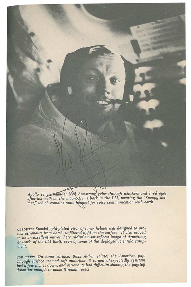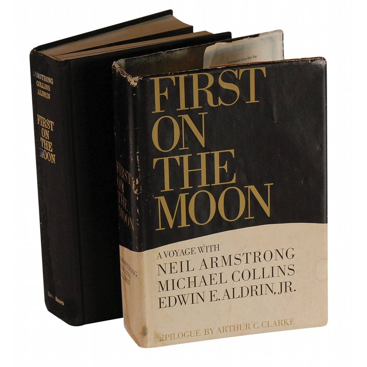 Signed book: First on the Moon. First edition. Boston: Little, Brown and Company, 1970. Hardcover with dustjacket, 5.75 x 8.75, 511 pages. Signed in black ballpoint on an inside image of Armstrong in the lunar module after his walk on the moon. Autographic condition: in fine condition, with some light dampstaining to bottom of signed page. Book condition: G/G. Black cloth-covered boards; extensive water-damage, mostly effecting second half of book (interior and exterior); several pages gently creased at lower corner; light foxing; shaken; previous owner’s gift inscription to half-title. Dust jacket has heavy water-damage and staining to entire back half; small chips/tears and creases along edges; slightly yellowed; rubbed and soiled.