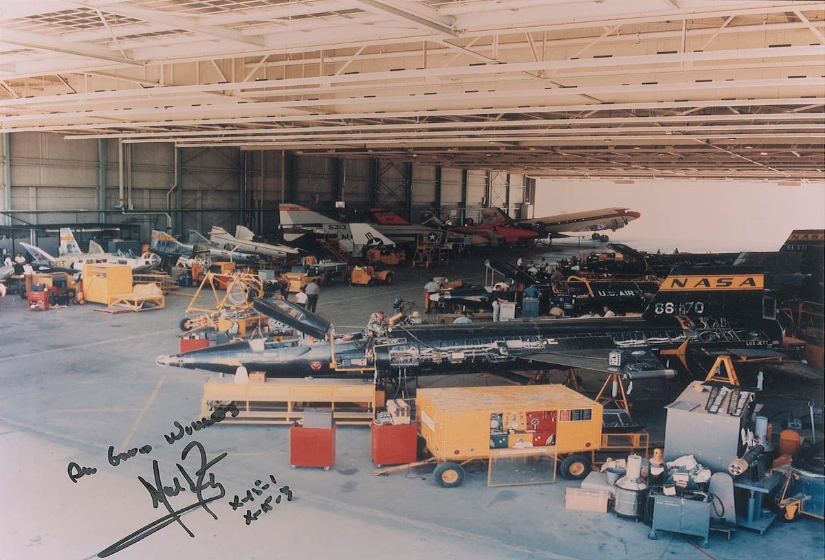 Uncommon color satin-finish 10 x 8 photo of X-15 planes in a hangar, signed in black felt tip, “All good wishes, Neil Armstrong, X-15-1, X-15-3.” In fine condition.