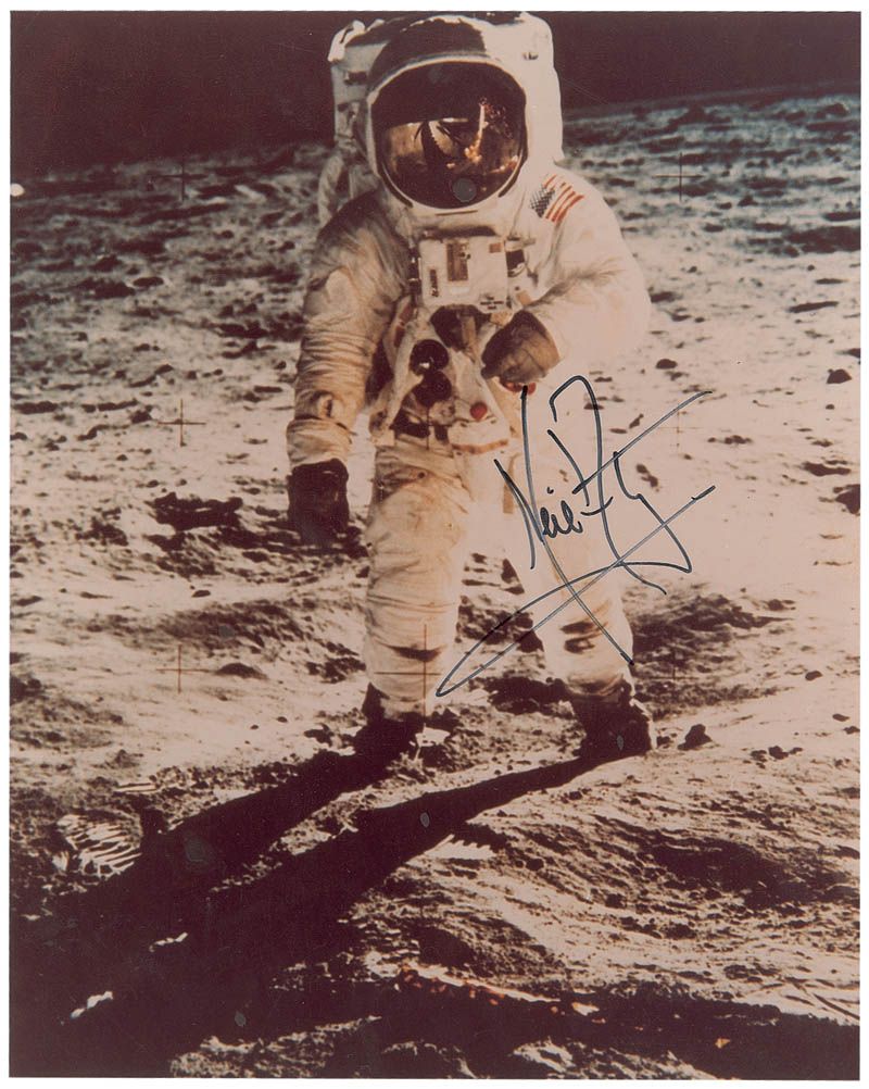 Color satin-finish 8 x 10 photo of Buzz Aldrin on the lunar surface, originally taken by Armstrong, signed in black felt tip. Some light creasing and scattered spotting to lower portion of image, with a few spots over portions of signature, otherwise fine condition. A lesser-seen uninscribed image from this most desirable of moonwalkers.