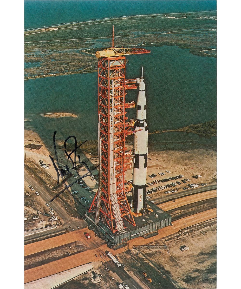 Color 6 x 9 Kennedy Space Center postcard photo of an Apollo Saturn V 500 F facility vehicle arriving at launch complex 39A, signed in black felt tip. In fine condition, with scattered mild rubbing to surface.