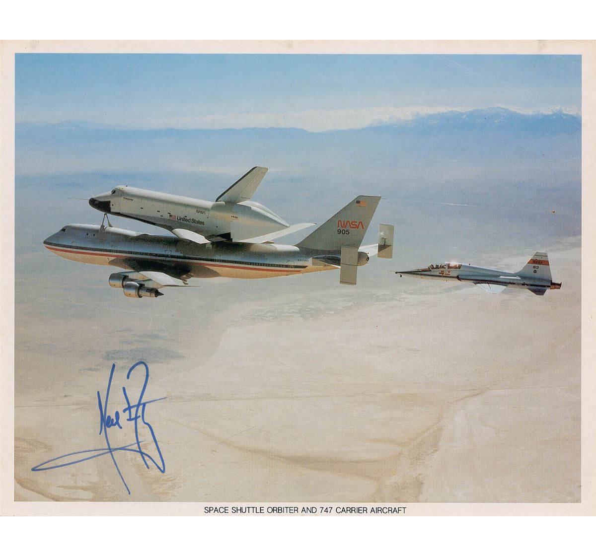 Color 10 x 8 NASA photo of the space shuttle Enterprise atop its 747 carrier aircraft, signed in blue felt tip. A few small, light creases (one just touching “A”) and small impressions to top margin, otherwise fine condition.