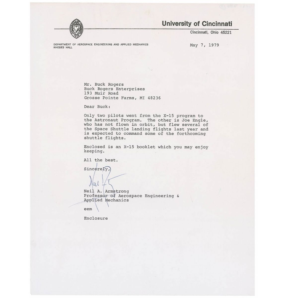 TLS, one page, 8.5 x 11, University of Cincinnati letterhead, May 7, 1979. Letter to his good friend Buck Rogers. In full: “Only two pilots went from the X-15 program to the Astronaut Program. The other is Joe Engle, who has not flown in orbit, but flew several of the Space Shuttle landing flights last year and is expected to command some of the forthcoming shuttle flights. Enclosed is an X-15 booklet which you may enjoy keeping.” In fine condition, with a paperclip impression to top edge and a few light creases and wrinkles. An interesting piece of correspondence between two names closely related with space travel.