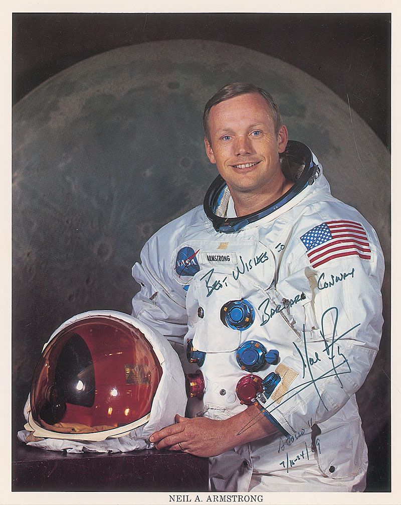 Color 8 x 10 NASA photo of Armstrong posing in his white space suit, his helmet by his side, signed and inscribed in black felt tip “Best wishes to Barbara Conway, Neil Armstrong,” adding “Apollo 11, 7/16-24/69.” In fine condition, with a couple scattered