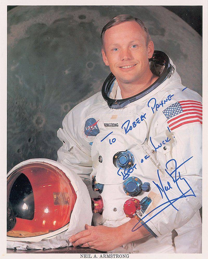 Color 8 x 10 NASA photo, boldly signed and inscribed in blue felt tip, “To Robert Payne—Best of Luck! Neil Armstrong.” In very fine condition, with a trivial spot to the lower left corner tip.