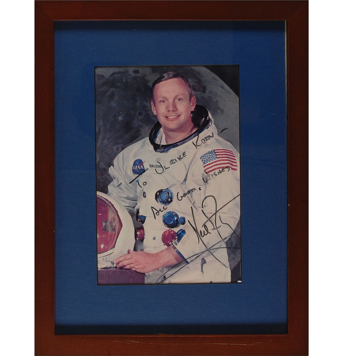 Color 5.25 x 8 NASA photo, signed and inscribed in black felt tip, “To Ulrike Korn—All Good Wishes, Neil Armstrong.” Matted and framed to an overall size of 10 x 13. Some brushing and irregular adhesion to the inscription and signature, otherwise fine condition.