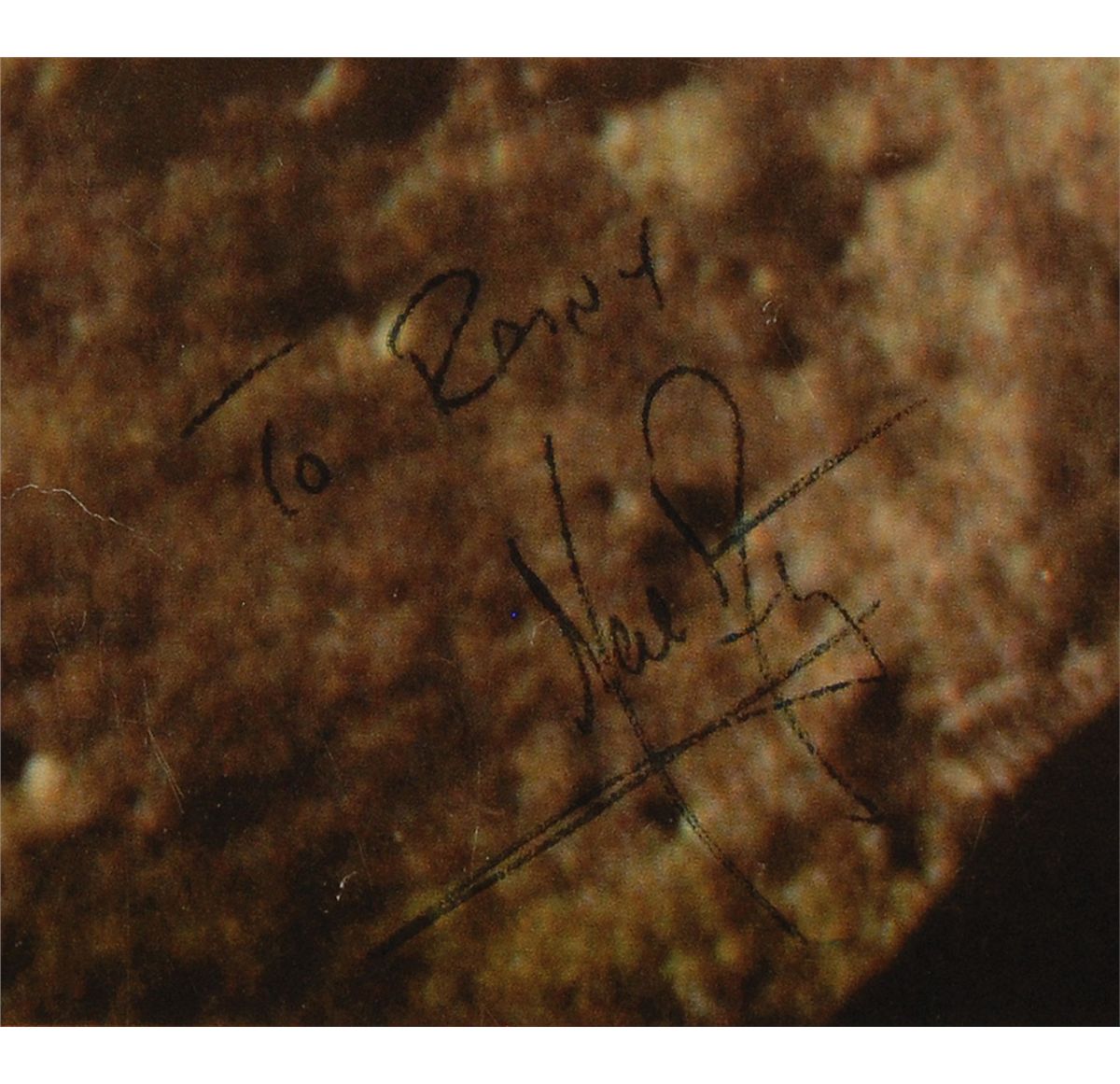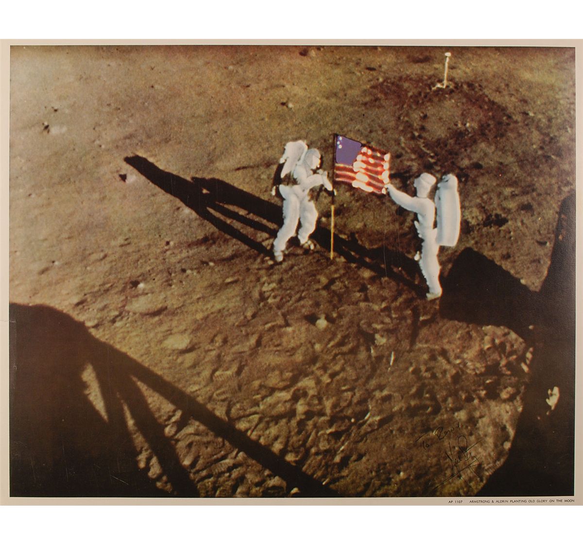 Color 20.75 x 16.5 NASA photo of the Apollo 11 moonwalkers, with a printed caption at the bottom which reads: "Armstrong & Aldrin Planting Old Glory on the Moon,” signed and inscribed in black felt tip, “To Rainy, Neil Armstrong.” In fine condition, with moderate contrast and light irregular adhesion to signature and inscription, a small tear to left edge, and scattered light surface marks.