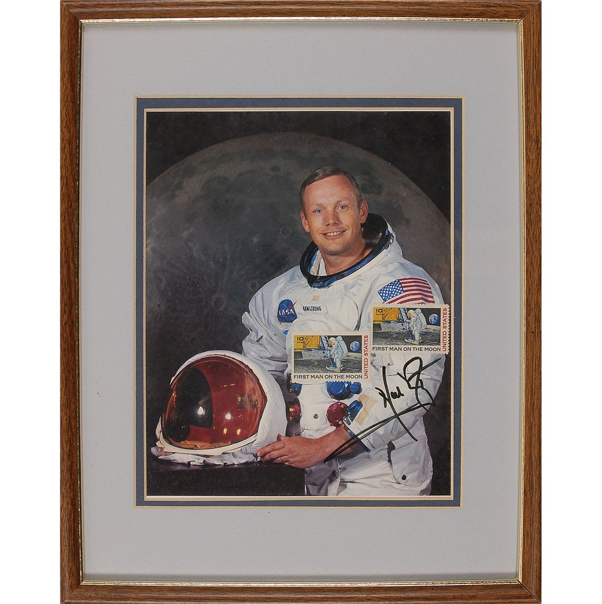 Color 8 x 10 NASA photo of Armstrong posing in his white space suit, his helmet by his side, signed in black felt tip. Double-matted and framed to an overall size of 11.75 x 14.75. A few light bends and ripples and two first man on the moon stamps affixed above signature covering an inscription, otherwise fine condition.
