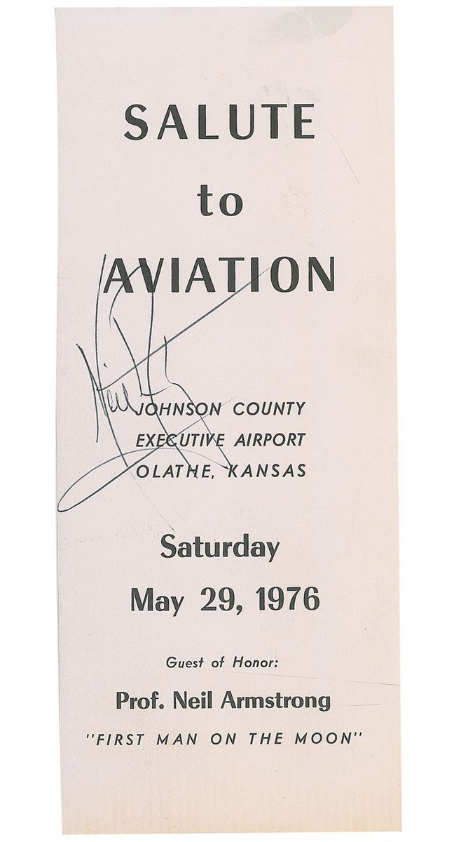 Program cover from the May 29, 1976, Salute to Aviation, 3.5 x 9, held at Johnson County Executive Airport in Olathe, Kansas, where Armstrong was the guest of honor. Nicely signed in black ballpoint. In fine condition. Accompanied by a letter of provenance from the original recipient.
