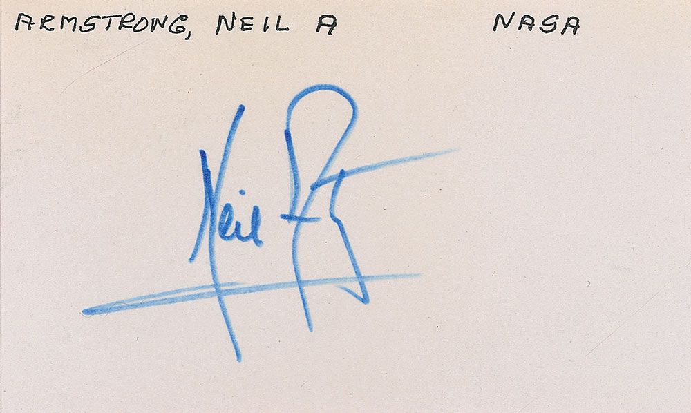 Felt tip signature, “Neil Armstrong,” on an off-white 5 x 3 card with collector’s notation along top edge. In fine condition. Accompanied by a letter of authenticity from James Spence.