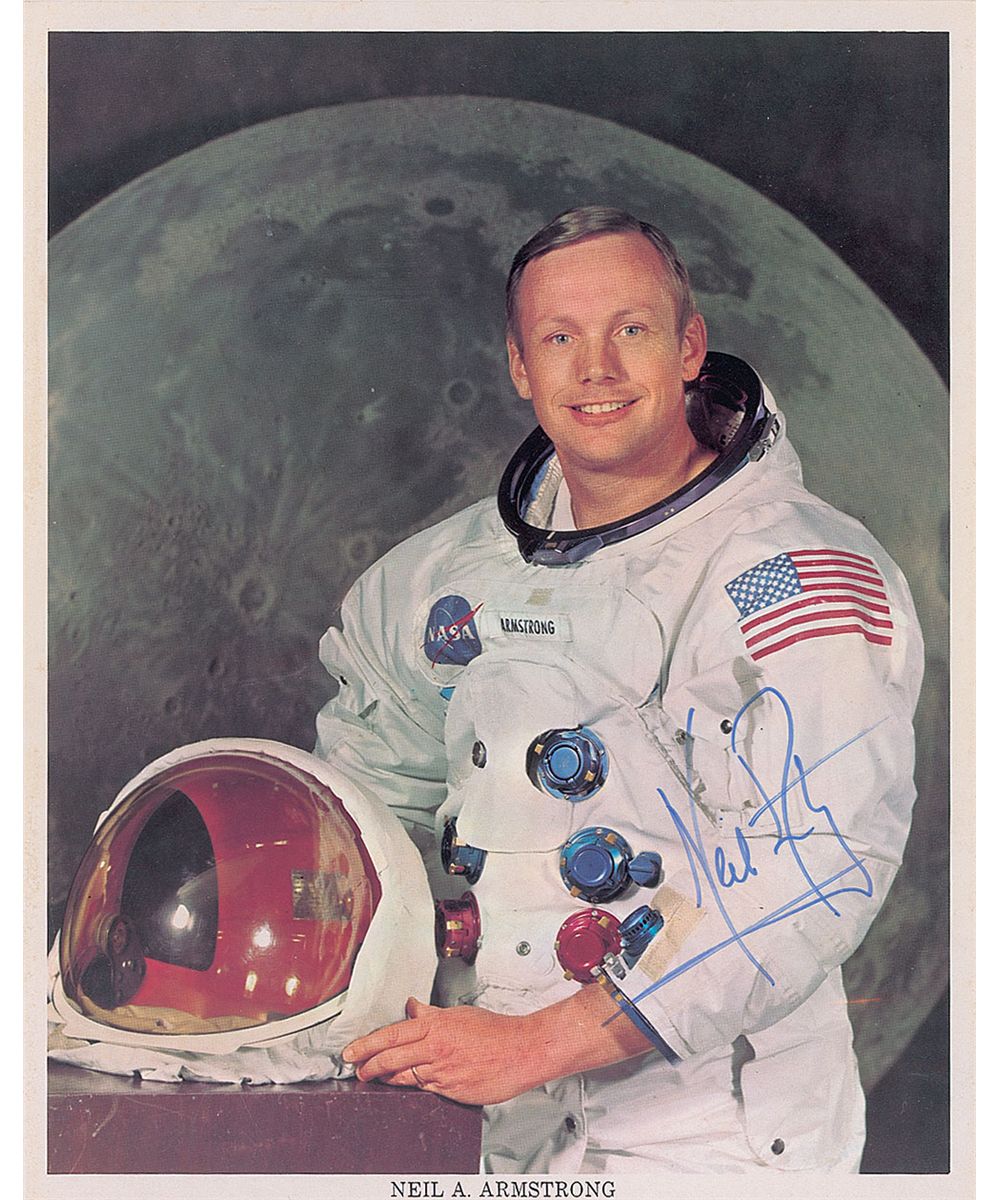 Extremely desirable uninscribed color 8 x 10 NASA photo of Armstrong posing in his white space suit, his helmet by his side, signed in blue felt tip. In very fine condition. Uninscribed photos of Armstrong represent one of the most coveted prizes in the entire field of space collecting.