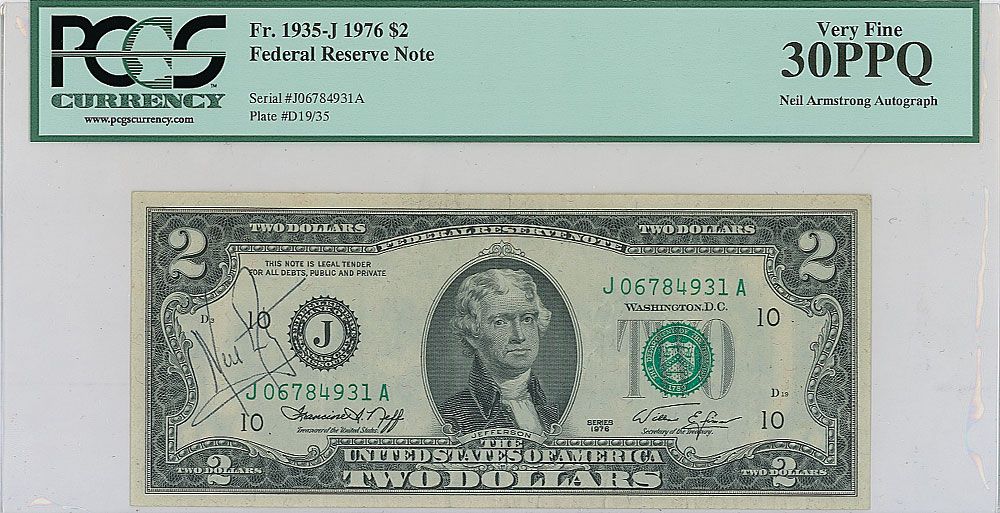 A series 1976 two dollar bill signed on the portrait side in black ballpoint by Armstrong. Signature was acquired at an airfield on May 29, 1976, and is accompanied by a letter of provenance from the original recipient. He writes, in full: “I met Neil Armstrong on May 29, 1976. He really wanted to fly in the 1929 Ford Tri Motor Airliner. While we were loading out passengers, he and I were in the cockpit visiting and he told me that his dad had bought him a ride when he was seven years old and that he made up his mind that aviation was going to be his career. I asked if I could get his autograph and he said sure. I had given all my small cash to the ticket agents selling our rides, all I had was a hundred dollar bill and a two dollar bill. I said Neil do you mind signing these? He smiled and said not if you don’t. I met Neil at events later, he always came over to see how the Tri Ford Motor and I were doing.” In fine condition. Bill is encapsulated in PCGS currency holder with a grade of “very fine,” and is accompanied by a full letter of authenticity from PSA/DNA.