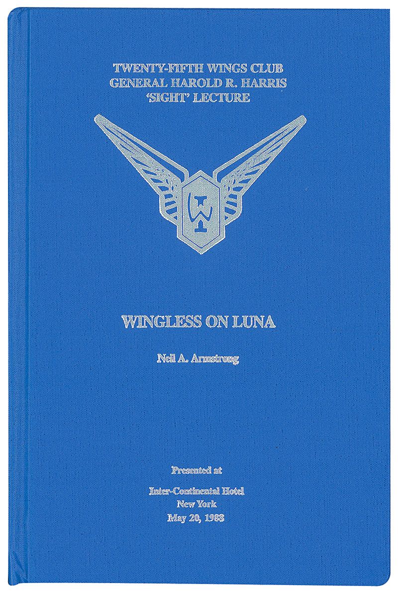 Unsigned book: Wingless on Luna. First edition, first printing. NY: 1988. Hardcover, 6.25 x 9.25, 25 pages. A rare book of the lecture Armstrong gave before the Wings Club at the Inter-Continental Hotel in New York on May 20, 1988. In fine condition.