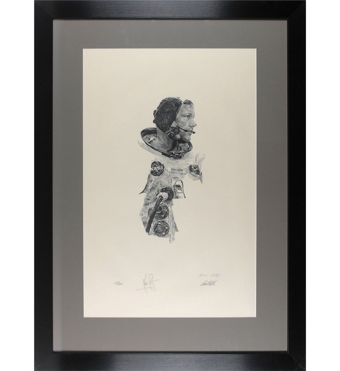 Limited edition 18 x 28 lithograph of Armstrong in his flight suit prior to the Apollo 11 mission, numbered 288/1000, signed in pencil by Armstrong at the National Air and Space Museum in 1976. Also signed in pencil by the artist, Paul Calle, beneath his pre-printed signature. Matted and framed to an overall size of 28.5 x 39. In fine condition. A highly sought after item as this is the only individual print edition that Armstrong signed. Oversized.