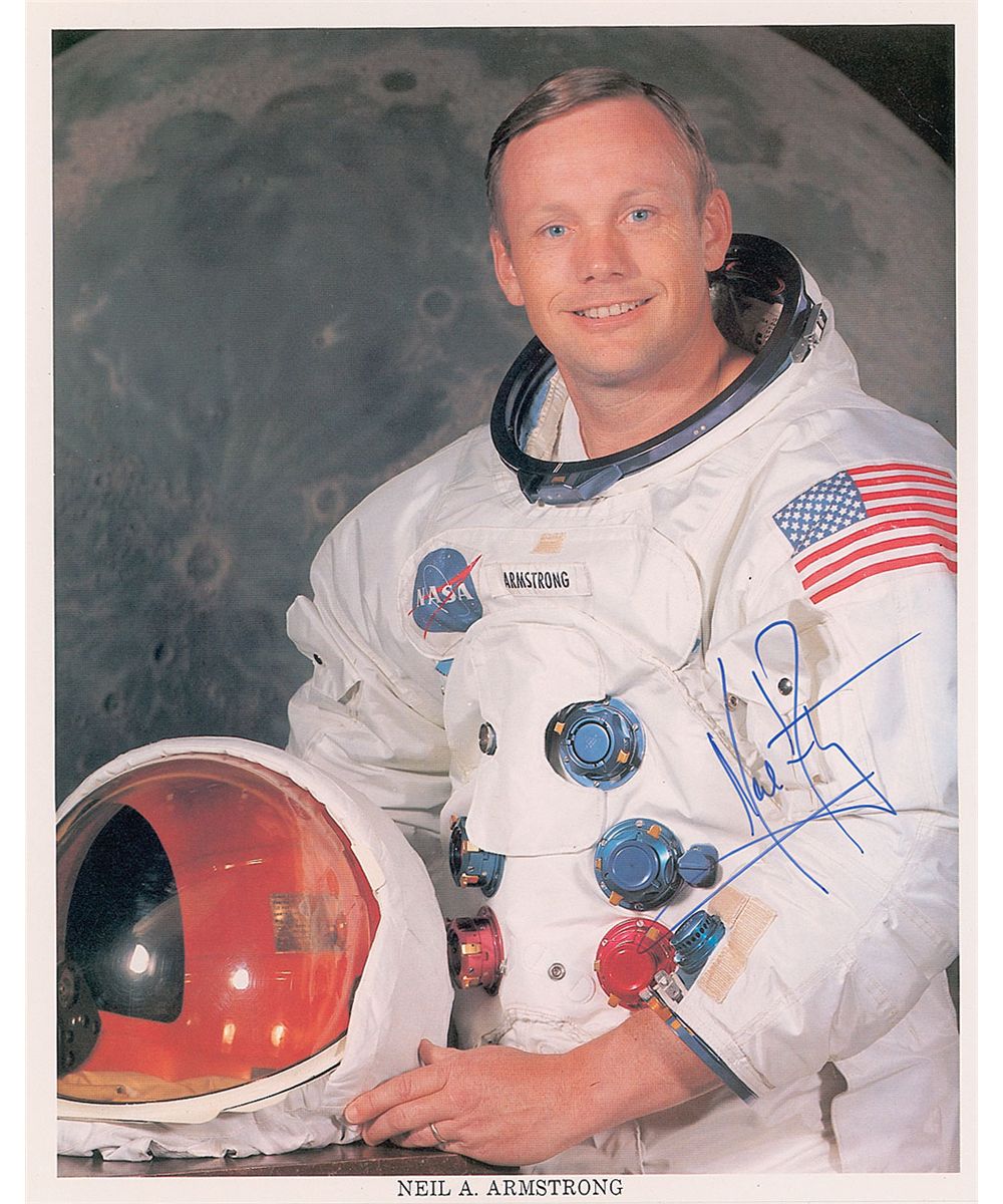 Extremely desirable uninscribed color 8 x 10 NASA photo of Armstrong in his white space suit, signed in crisp blue felt tip. In fine condition, with a paperclip impression to the upper left and slight crease to upper right. A fantastic example with an unusually bold signature.