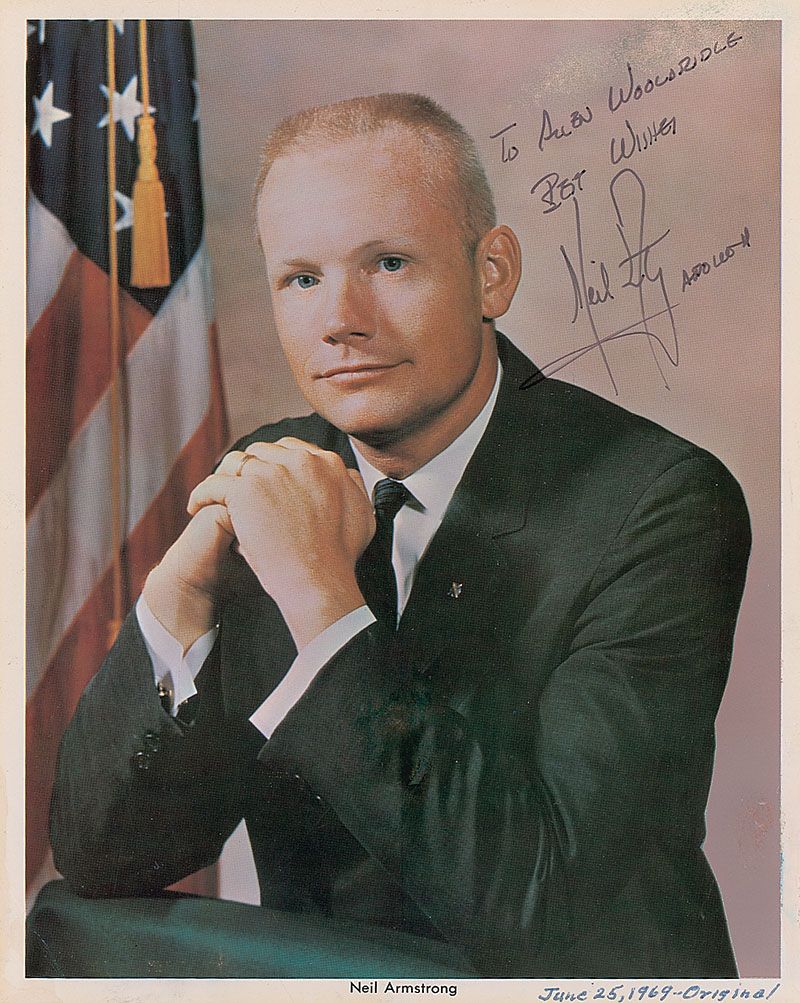 Color vintage 8 x 10 NASA photo of Armstrong in formal attire, signed and inscribed in black felt tip, “To Allen Wooldridge, Best Wishes, Neil Armstrong, Apollo 11.” A notation to the lower border reads, “June 25, 1969—Original,” and reverse bears a description of the moon landing written by the original recipient. Some rubbing to the upper right (touching the top of the inscription), and a crease to the lower left corner, otherwise fine condition.