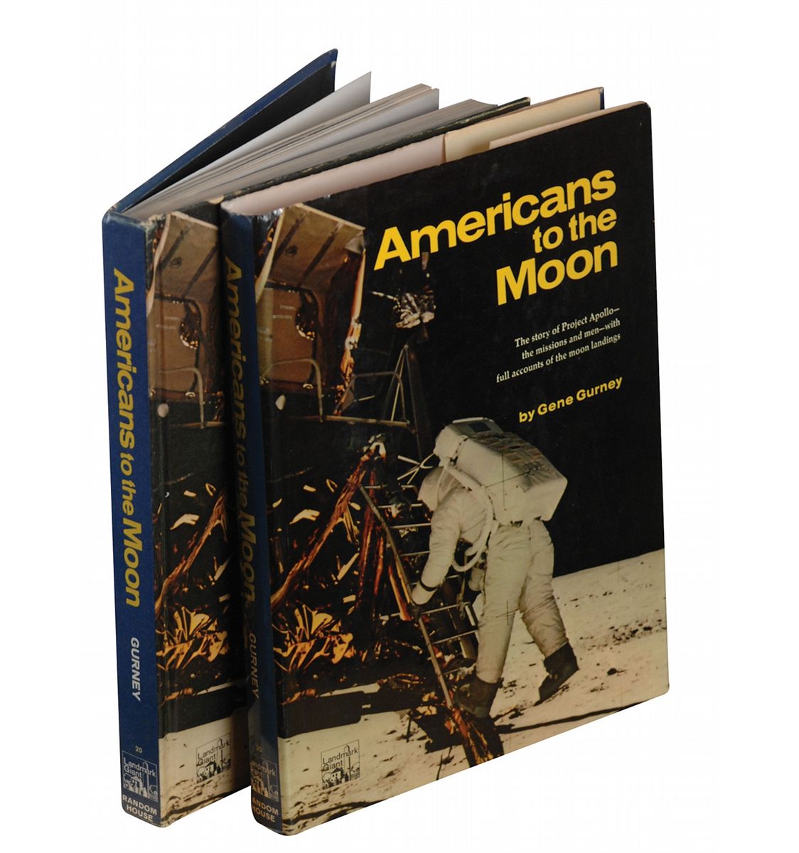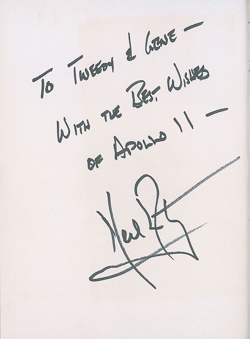 Signed book: Americans to the Moon. First edition. NY: Random House, 1970. Hardcover with dust jacket, 8.5 x 11.5, 148 pages. Signed and inscribed in black felt tip on the reverse of the first free end page, “To Tweedy & Gene—With the best wishes of Apollo 11—Neil Armstrong.” Autographic condition: fine. Book condition: VG/VG. Illustrated paper-covered boards; mild wear to edges, with small bumps at corners and spine-ends; slightly shelf-cocked. Dust jacket in protective plastic sleeve; creasing and few tiny tears to edges (mostly at corners and spine-ends); spine slightly sunned; flaps yellowed; small remnants of price sticker on front flap. A particularly large signature with a seldom-seen “Apollo 11” addition.