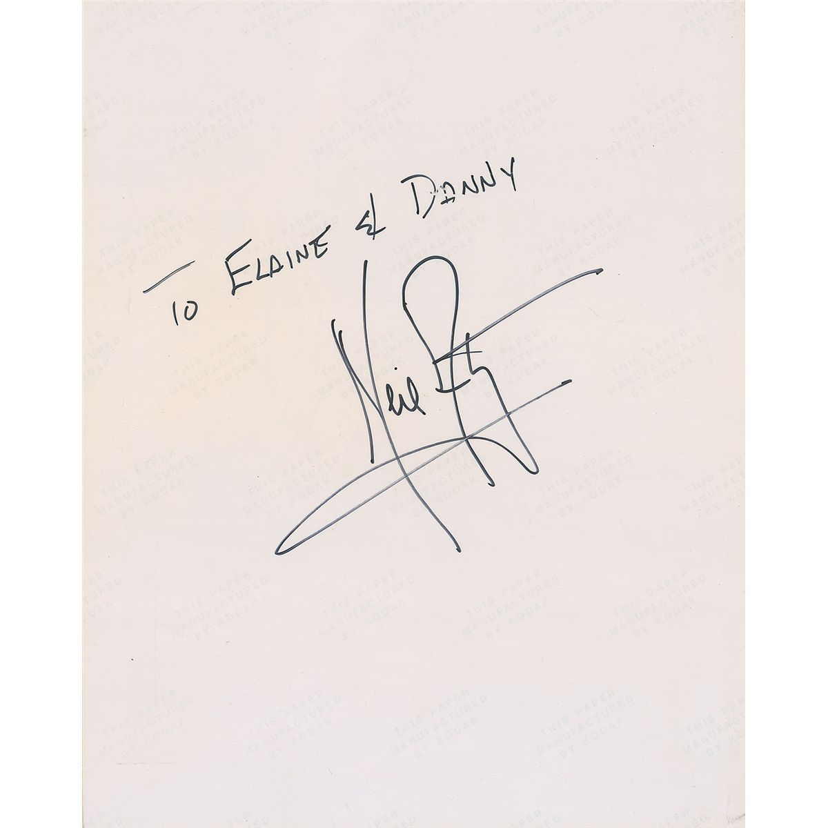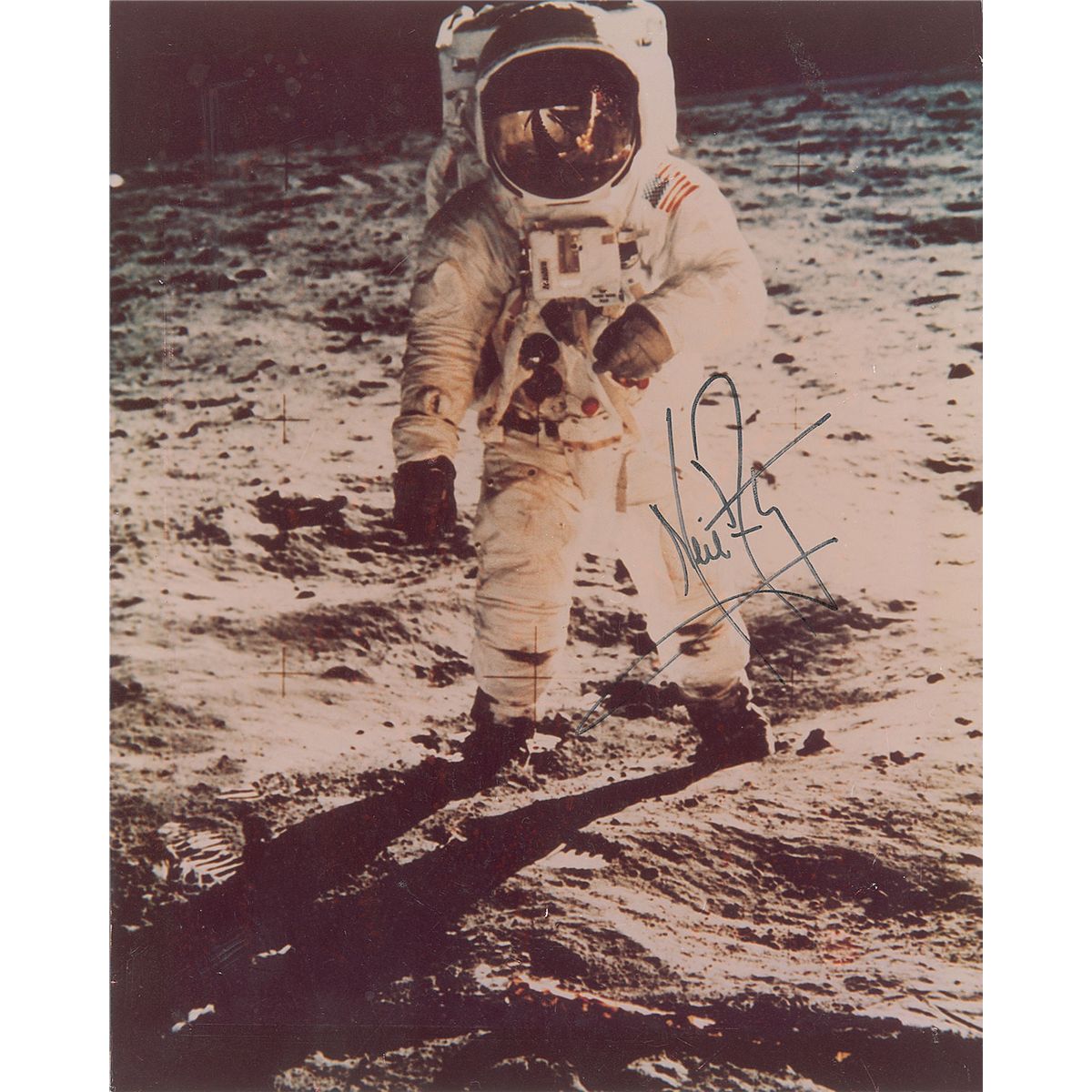 Practically nonexistent color satin-finish 8 x 10 photo of Buzz Aldrin walking on the moon, beautifully signed in black felt tip, “Neil Armstrong,” and signed and inscribed again on the reverse, “To Elaine & Danny, Neil Armstrong.” In fine condition, with some light spotting to top portion of background. Armstrong’s signature on the reverse measures a whopping 5? in length. According to the Smithsonian Institute, they are aware of no other examples of twice-signed photos from Armstrong; the rarity, combined with the uninscribed image side, elevate this photo to the extreme upper tier of Armstrong photos to become available.