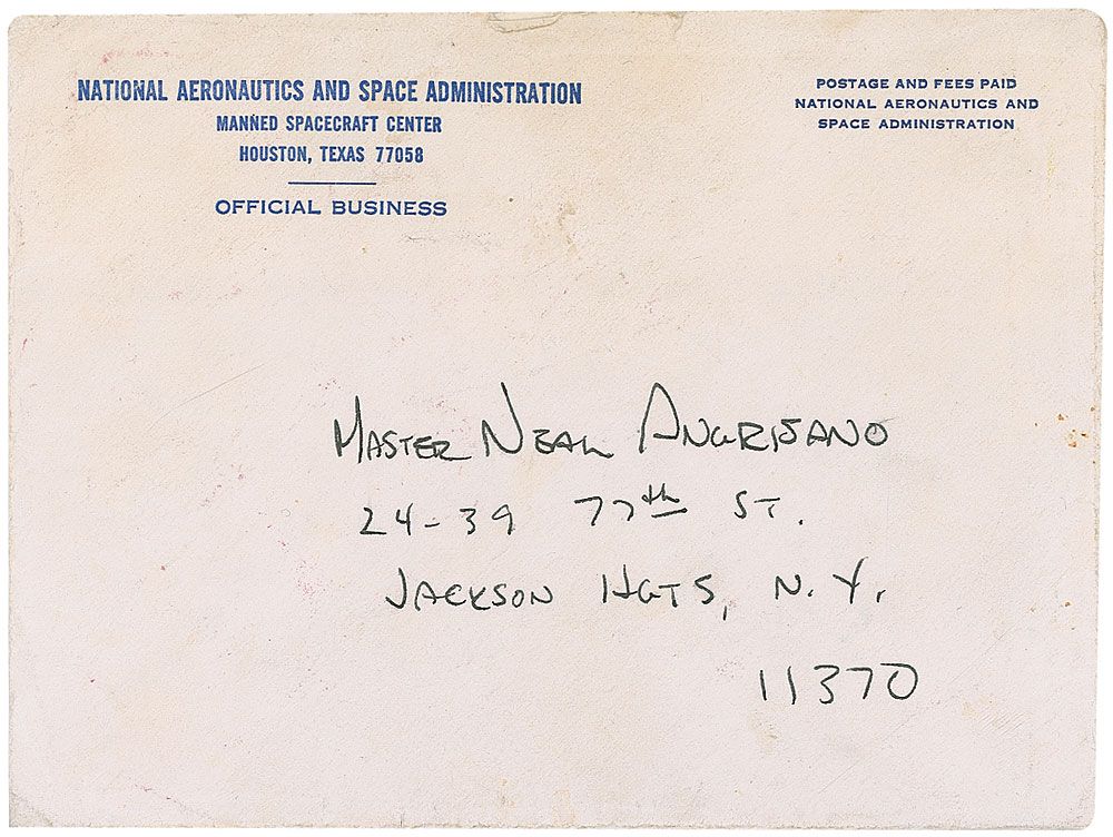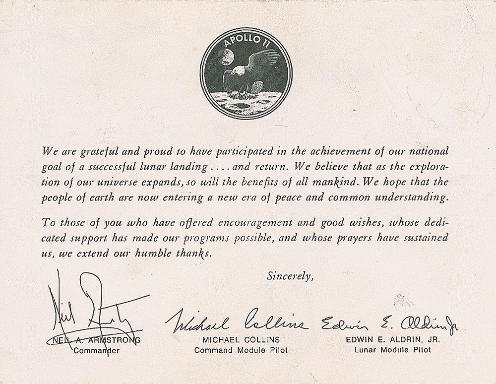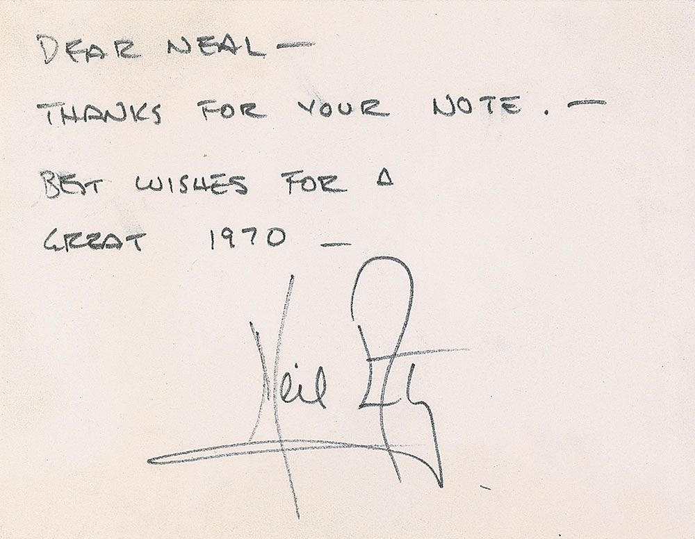 Scarce ALS, one page, 5.5 x 4.25, no date (but circa late 1969–early 1970). Brief letter to a young admirer, written on the inside of an Apollo 11 notecard, with an Apollo 11 mission insignia on the front, as well as a printed message of thanks, and pre-printed signatures of all three crew members. Inside, Armstrong writes, “Dear Neal—Thanks for your note.—Best wishes for a great 1970—.” In fine condition, with a few light creases. Accompanied by the original mailing envelope, addressed in Armstrong’s hand. Any handwritten correspondence from Armstrong is quite rare, particularly so close to his historic mission.