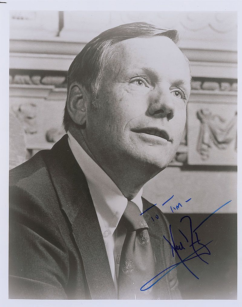 Glossy 8 x 10 head-and-shoulders photo of Armstrong in a suit and tie, signed and inscribed in blue felt tip, “To Tim—Neil Armstrong.” In fine condition, with a light horizontal bend through facial area, visible only at an angle.