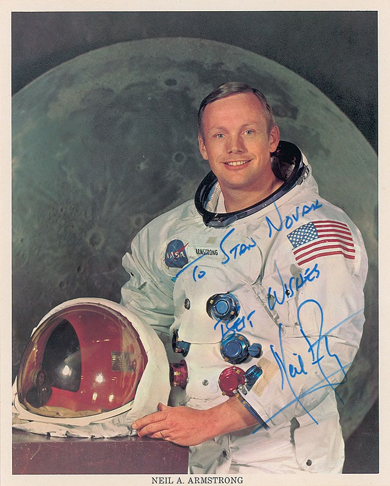 Color 8 x 10 NASA photo of Armstrong in his white space suit, signed and inscribed in bold blue felt tip, “To Stan Novak, Best Wishes, Neil Armstrong.” In fine condition. Accompanied by a full letter of authenticity from JSA.