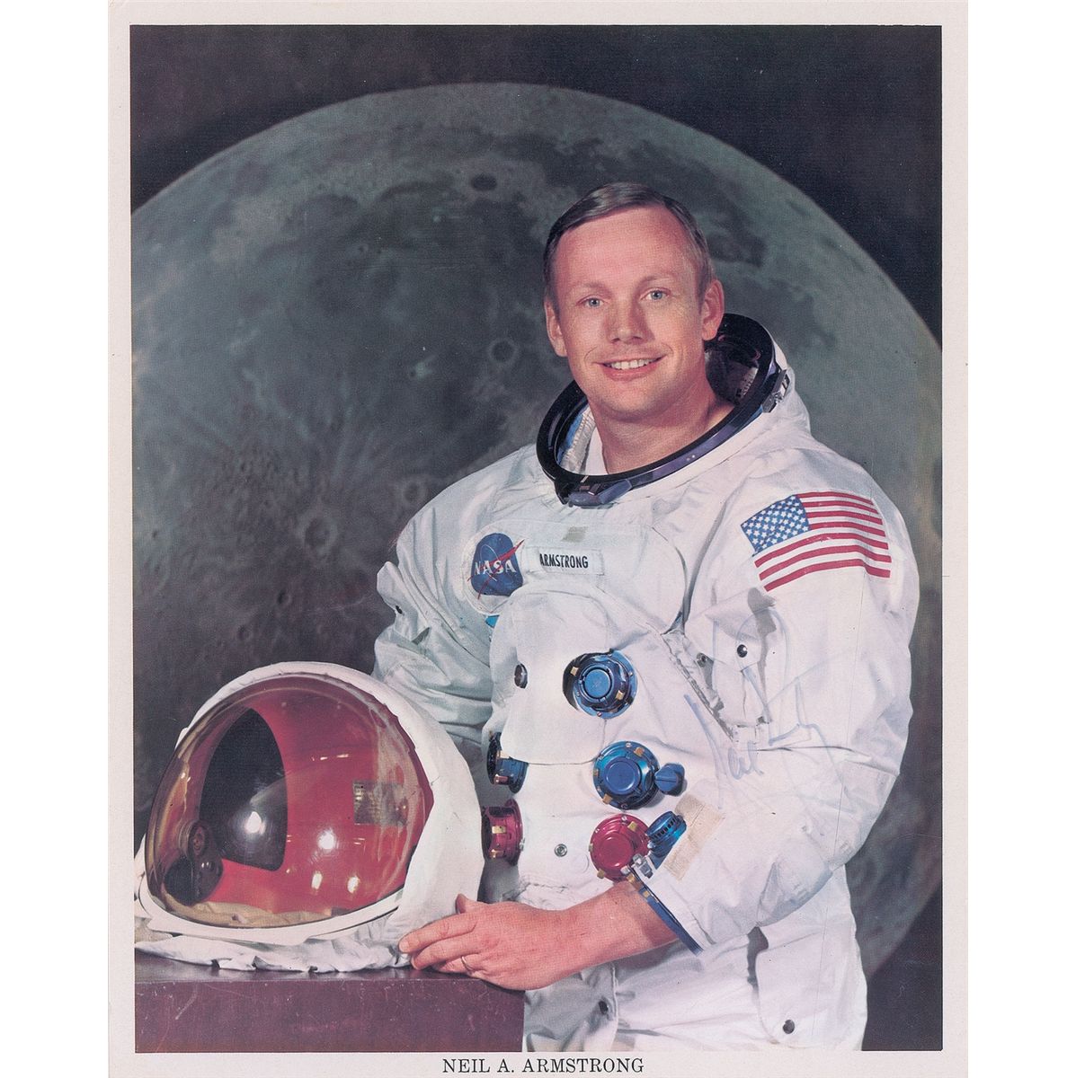 Color 8 x 10 NASA photo of Armstrong posing in his white space suit, signed in blue felt tip. The signature quite faded but visible, otherwise fine condition. Uncommon in uninscribed examples.