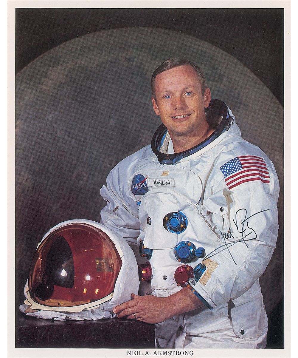 Choice uninscribed color 8 x 10 NASA photo of Armstrong in his white space suit, signed in black felt tip. In fine condition. A fantastic example with a bold, crisp signature.