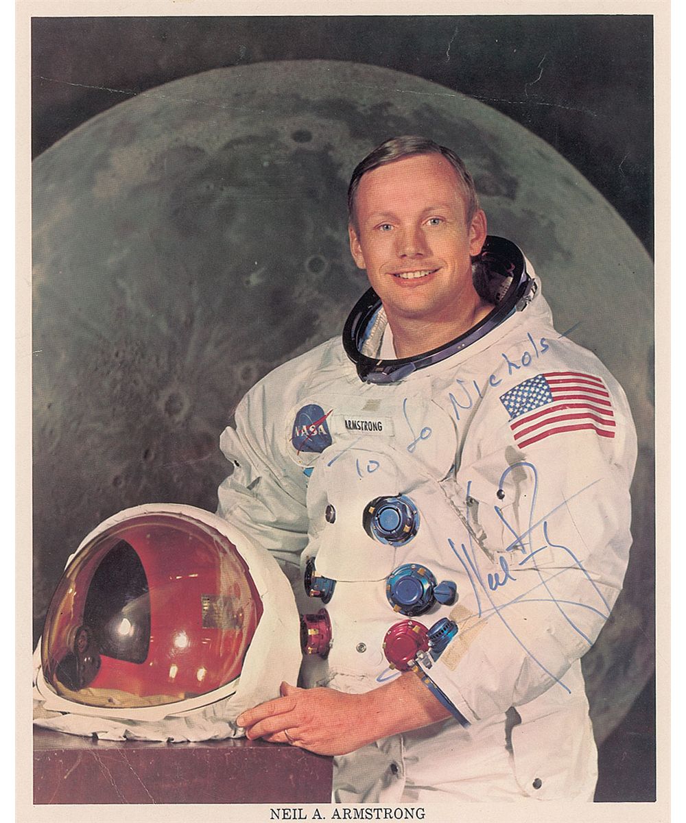 Color 8 x 10 NASA photo of Armstrong posing in his white space suit against a lunar background, signed and inscribed in blue felt tip “To Jo Nichols—Neil Armstrong.” In very good condition, with several noticeable creases to top portion of background and lower left corner.
