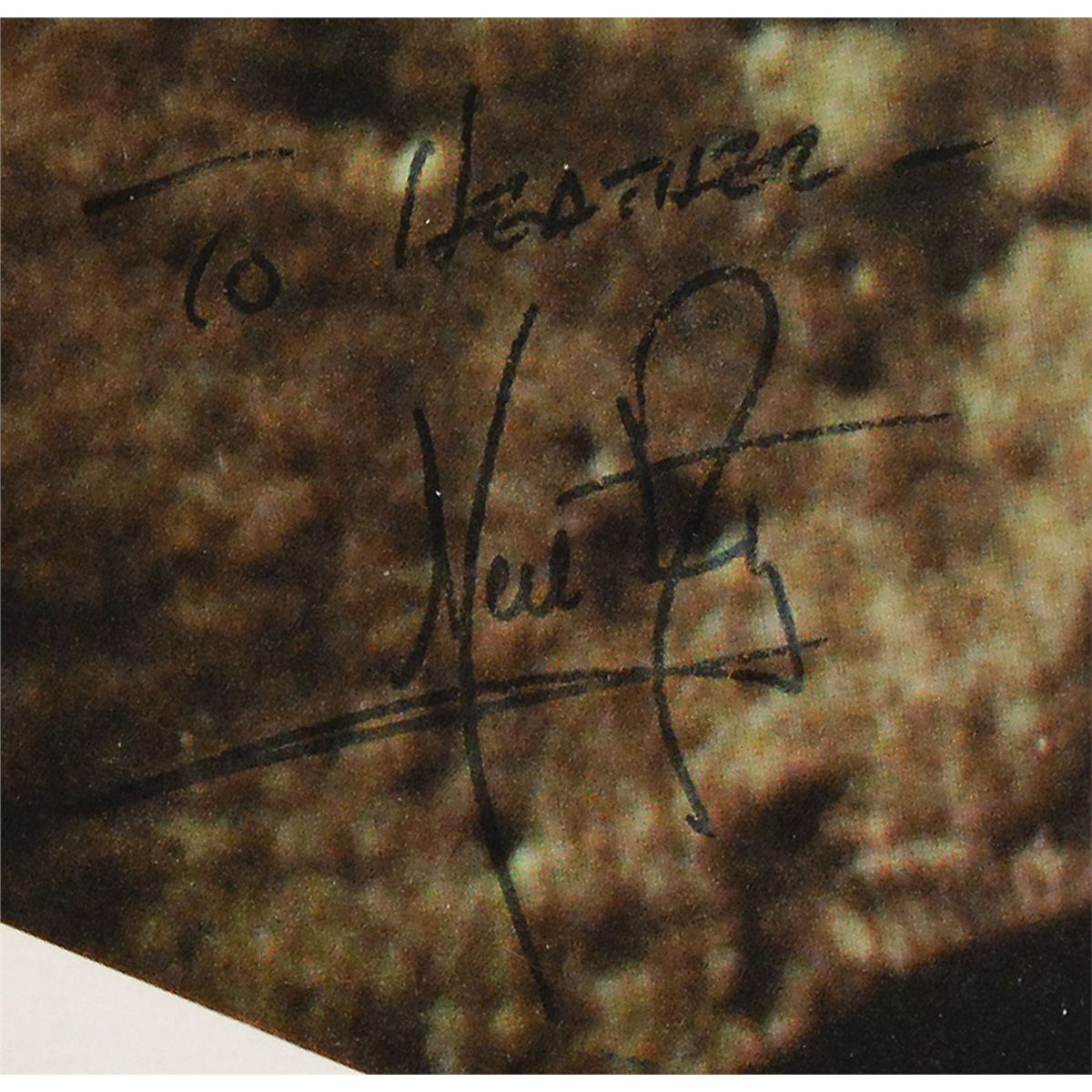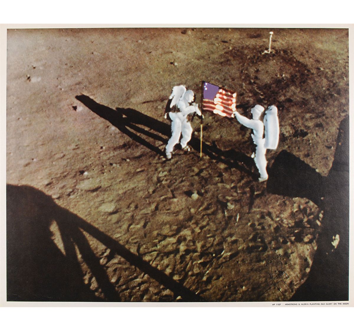Very nice color 20.75 x 16.75 print entitled ‘Armstrong & Aldrin Planting Old Glory on the Moon’ AP 1107, signed and inscribed in black felt tip, “To Heather—Neil Armstrong.” In fine condition, with light contrast to signature and inscription and a couple scattered wrinkles.