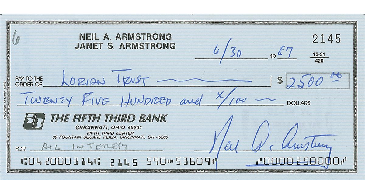 Extremely rare personal check, 6 x 2.75, filled out and signed by Armstrong, “Neil A. Armstrong,” payable to Lorian Trust for $2500.00, June 30, 1987. Pencil notation by Armstrong on the memo line reads, “All Interest.” In very fine condition. In 1973, Armstrong was president of Lorian, Inc., a business in Lebanon, Ohio, where he lived at the time. Virtually unobtainable, this is just the third Armstrong check we have offered in over 30 years.