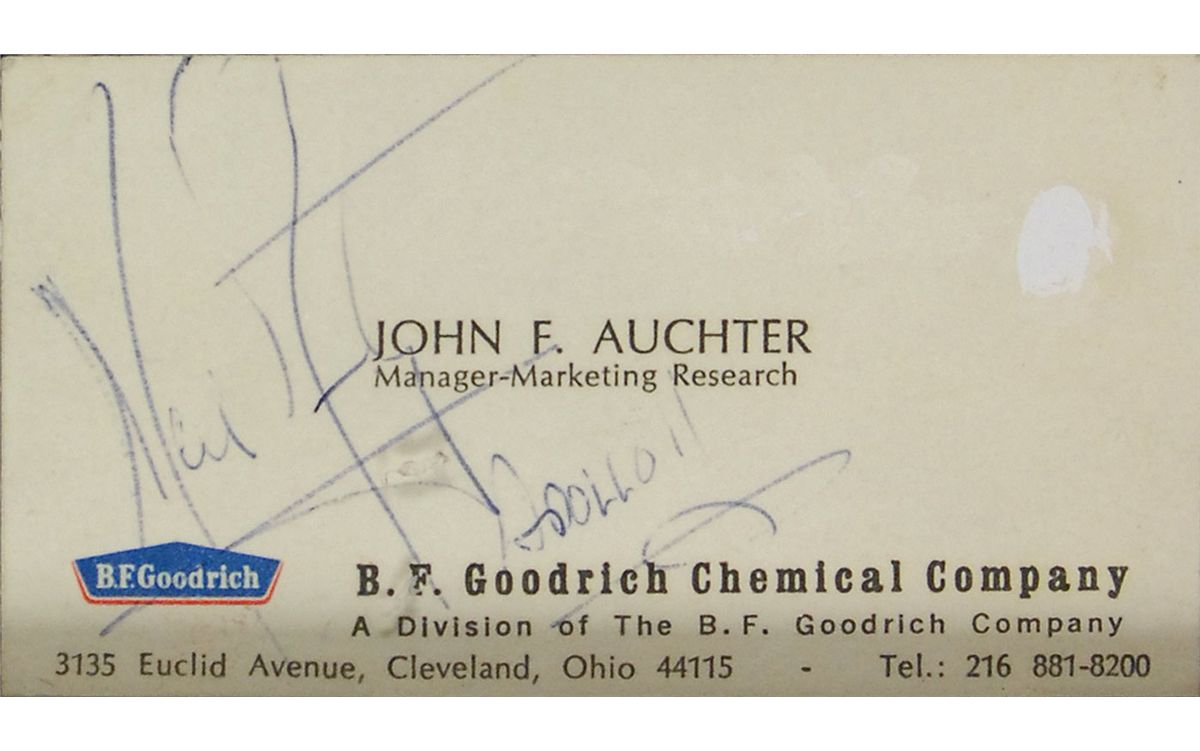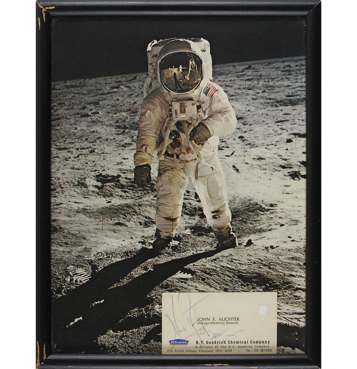 Business card for a B. F. Goodrich Chemical Company employee, 3.5 x 2, signed in blue ballpoint, “Neil Armstrong, Apollo 11.” Card is affixed to a color photo of Buzz Aldrin on the moon, taken by Armstrong (who is visible in Aldrin’s sun visor), and framed to an overall size of 8.75 x 11.25. In fine condition, with a uniform shade of mild toning to card, as well as a small spot to right edge.