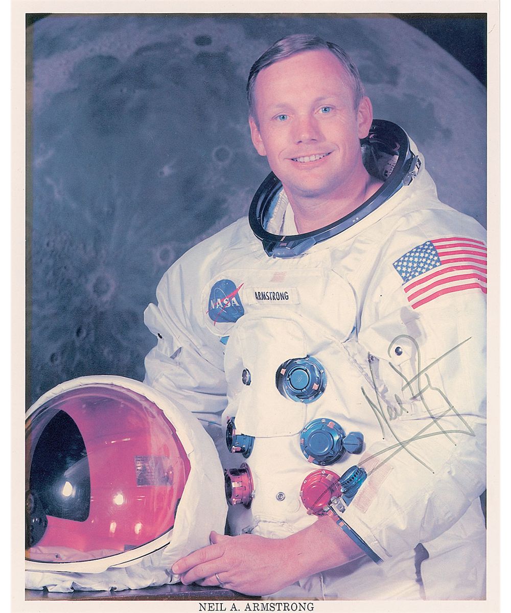 Highly-desirable uninscribed color 8 x 10 NASA photo of Armstrong posing in his white space suit against a lunar background, signed in black felt tip. In fine condition, with a few small creases, and the signature and image lightly, and uniformly, faded, with the colors remaining quite vivid.