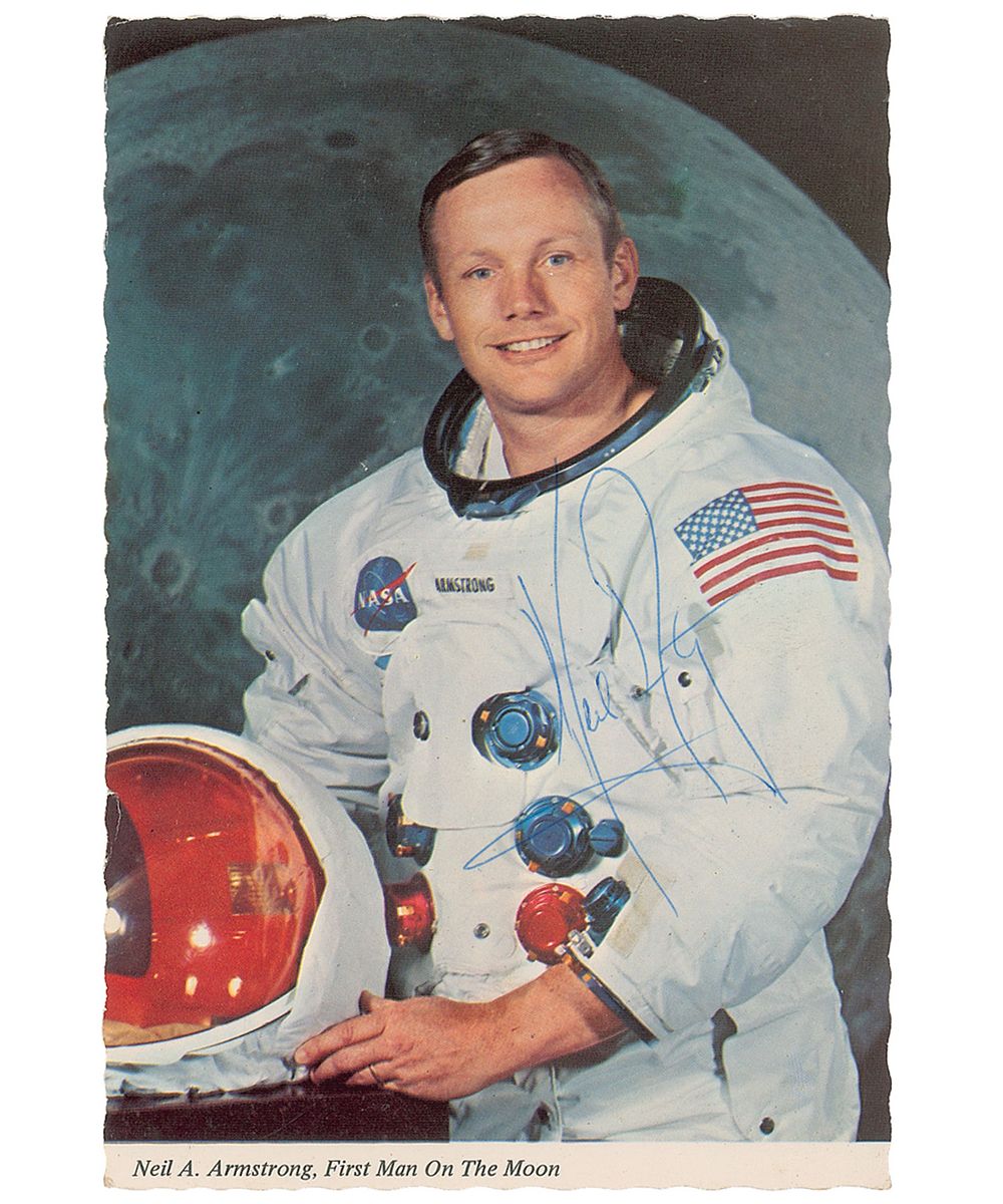 Color vintage 4 x 6 postcard photo of Armstrong posing in his white space suit against a lunar background, signed in blue ballpoint. In fine condition, with a few scattered light surface marks and a ding to left edge. Signature was obtained in November of 1969 at a dinner attended by Armstrong at the home of the newly installed president of Wittenberg University, Dr. G. Kenneth Andeen, the same week Armstrong was presented an honorary doctorate.