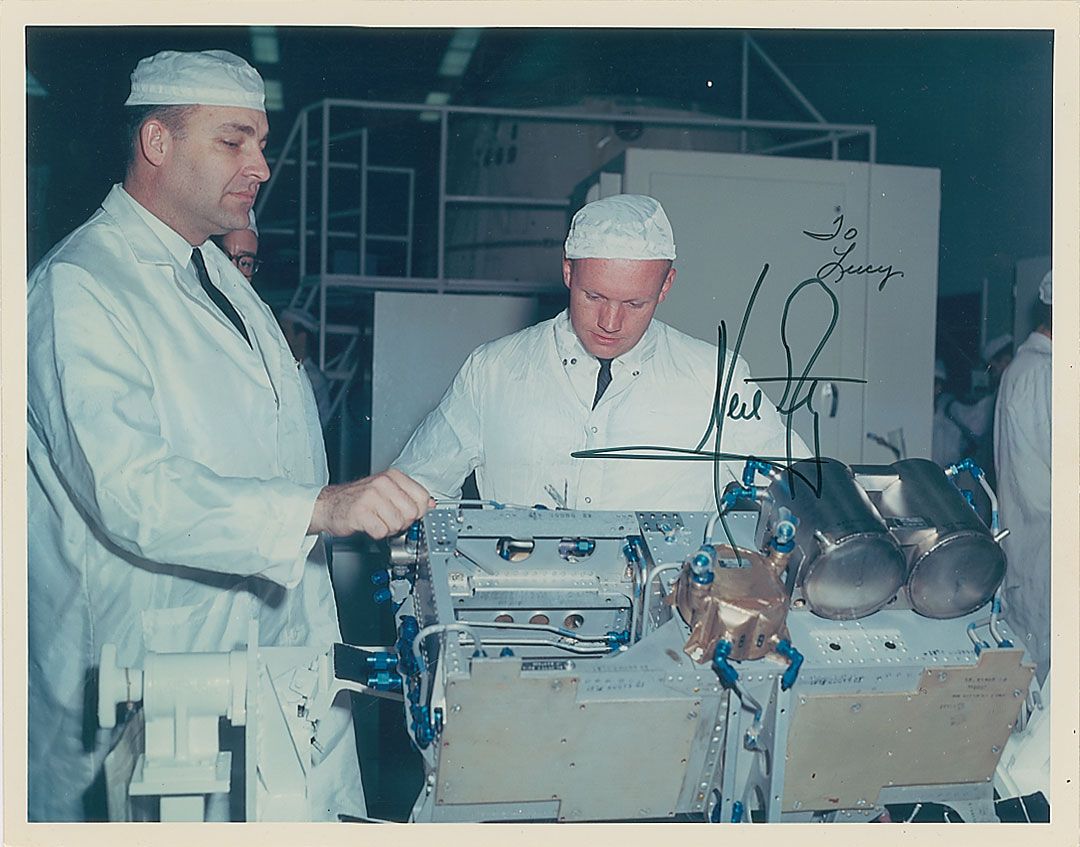 Color 10.75 x 8.5 double-weight McDonnell Douglas photo of Armstrong in a McDonnell Douglas ‘clean room’ inspecting a piece of equipment, signed in black felt tip, with a brief inscription added above his signature in an unknown hand. In fine condition, with a couple of light surface impressions. Accompanied by a full letter of authenticity from PSA/DNA.
