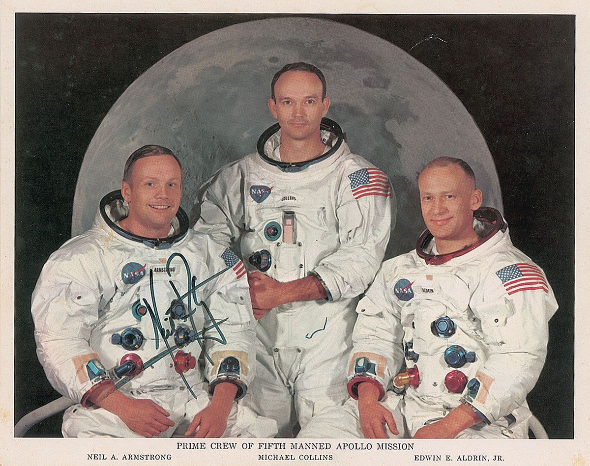 Color 10 x 8 NASA litho of the prime crew of Apollo 11, signed in black felt tip by Armstrong. In fine condition, with a small stray ink mark to right of signature, a couple trivial spots to border, and a couple of creases near top.