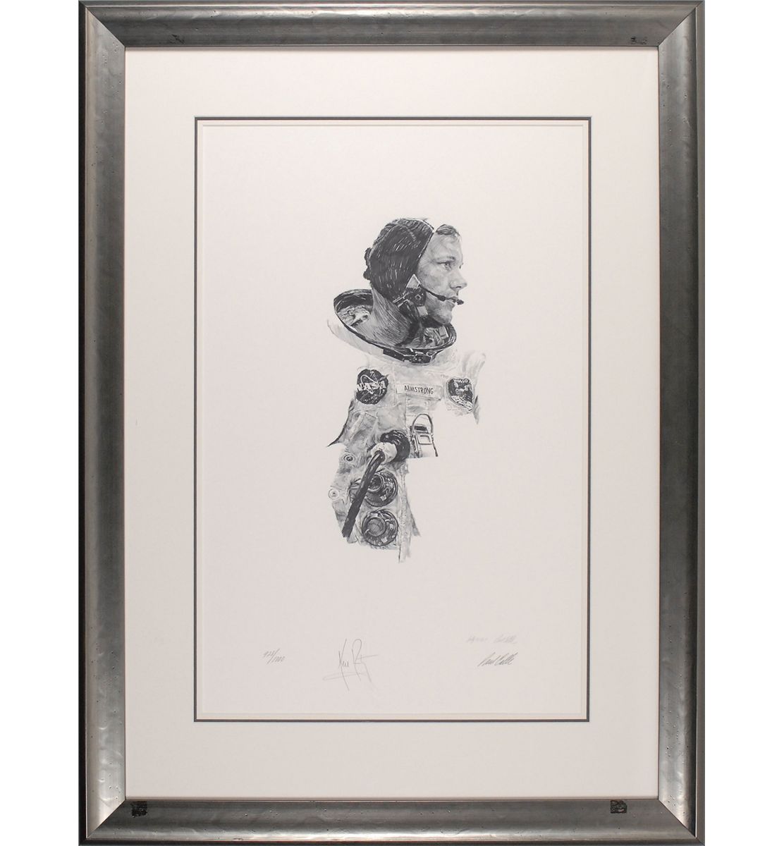 Limited edition 16.5 x 26 lithograph of Armstrong in his flight suit prior to the Apollo 11 mission, numbered 928/1000, signed in pencil at the National Air and Space Museum in 1976. Also signed in pencil by the artist, Paul Calle, beneath his pre-printed signature. Double-matted and framed to an overall size of 28 x 38. In very fine condition. Oversized.