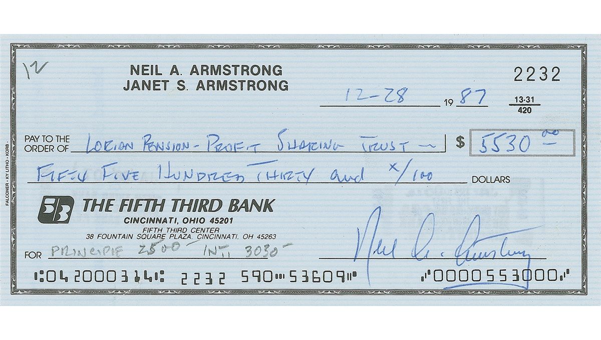 Personal check, 6 x 2.75, filled out and signed by Armstrong, “Neil A. Armstrong,” payable to Lorian Pension–Profit Sharing Trust for $5530.00, December 28, 1987. A pencil notation, written by Armstrong in the memo line reads, “Principle 2500—Int. 3030—.” In fine condition, with just slight show-through from bank stamps on reverse. Armstrong was president of Lorian, Inc., a business in Lebanon, Ohio, where he lived at the time. Incredibly scarce, this is only the fourth Armstrong check we have offered in over 30 years.