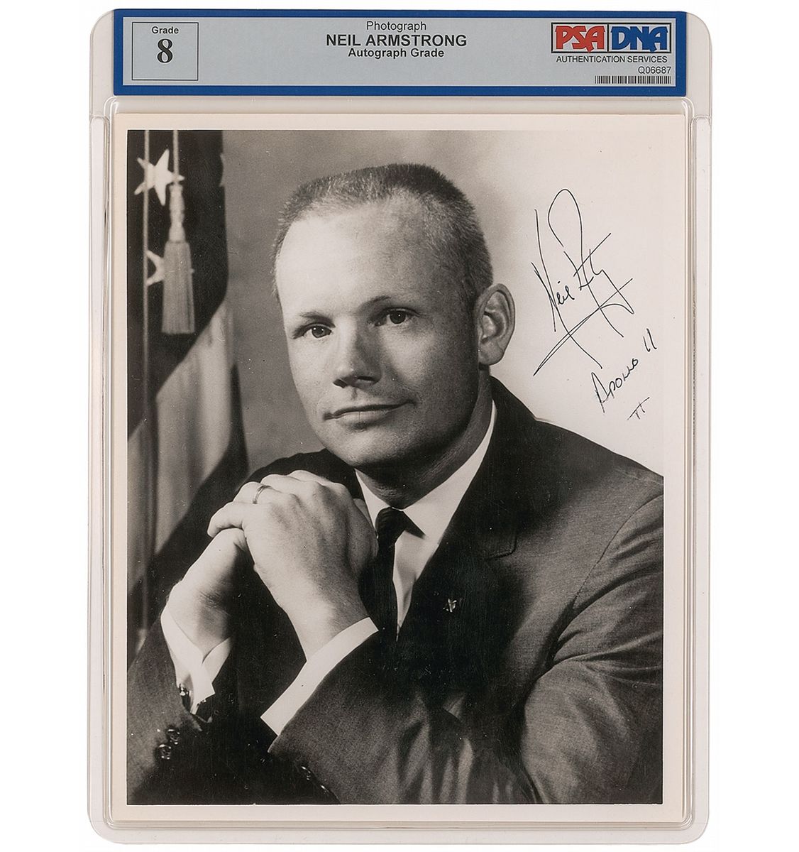 Vintage glossy 8 x 10 photo of Armstrong in a jacket and tie posing in front of an American flag, signed in black ink, “Neil Armstrong, Apollo 11.” Encapsulated in a plastic PSA/DNA grading holder. In fine condition, with a bit of light irregular ink adhesion to “Apollo.” Accompanied by a full letter of grading and authenticity from PSA/DNA, grading the autograph an “8.” Any photo with Armstrong adding his mission is quite scarce, even more so in vintage examples.