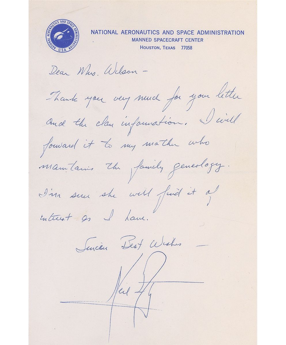 ALS, one page, 5.25 x 8, NASA letterhead, no date. Letter to “Mrs. Wilson.” In full: “Thank you very much for your letter and the clan information. I will forward it to my mother who maintains the family genealogy. I’m sure she will find it of interest as I have.” In fine condition. A particularly early and beautifully penned example referring to Armstrong’s interest in genealogy, with the astronaut’s own clan tracing back to Langholm, Scotland.
