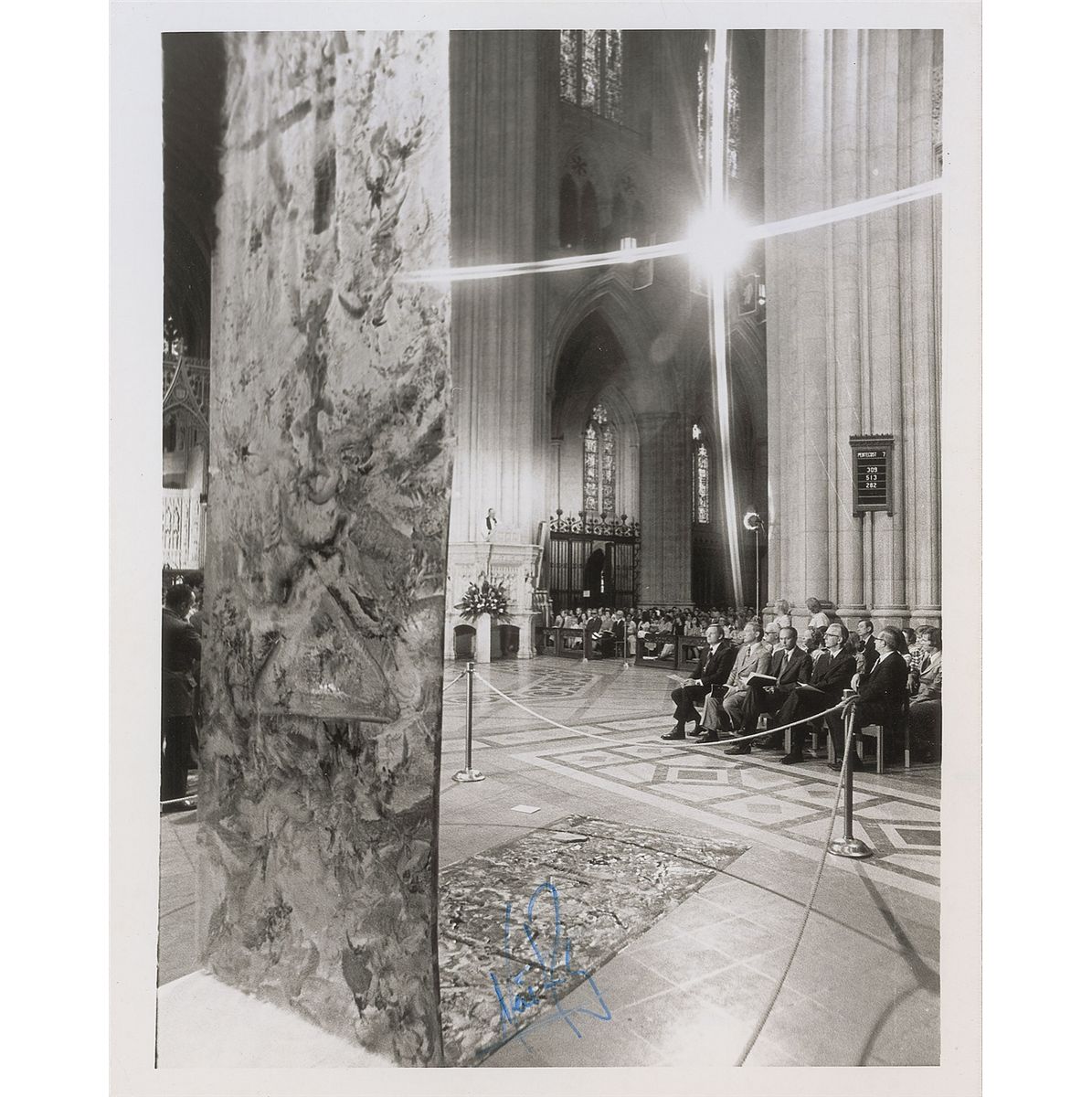 Glossy 8 x 10 NASA photo of the mass given in honor of the fifth anniversary of the Apollo 11 mission at the Washington Cathedral, showing the crew members seated in the front row, signed in blue felt tip. In fine condition, with signature a few shades light, but still legible, and some light corner tip creases.