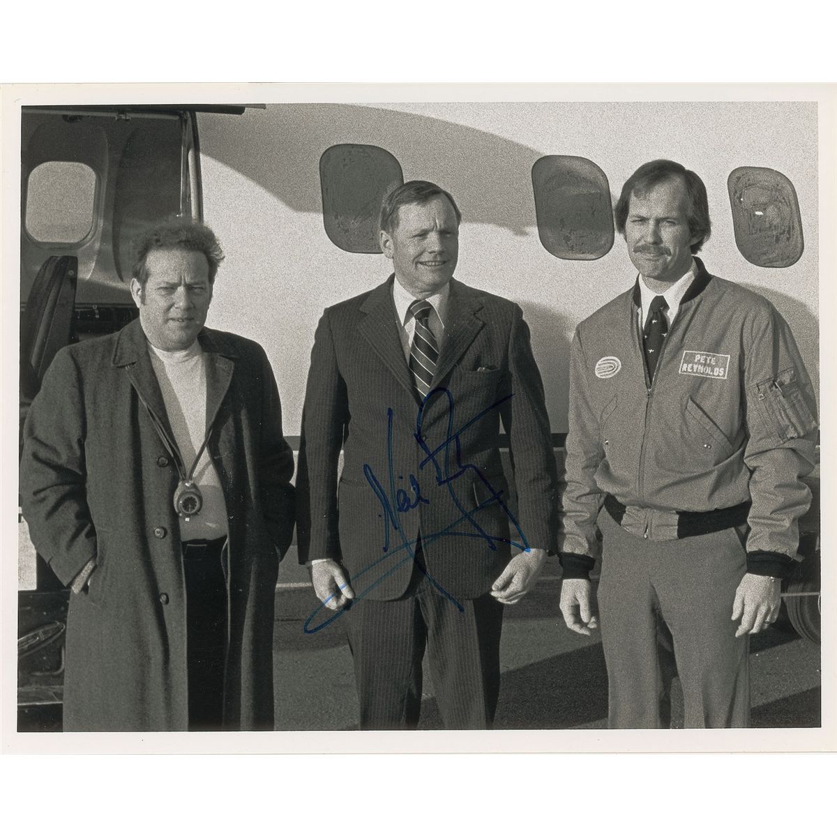 Glossy 10 x 8 photo of Armstrong standing alongside his co-pilot Pete Reynolds and observer Don Berliner, signed in blue felt tip by Armstrong. Moderate contrast to signature, otherwise fine condition. Armstrong and Reynolds set five world records while flying a Learjet, including reaching an altitude of 50,000 feet.