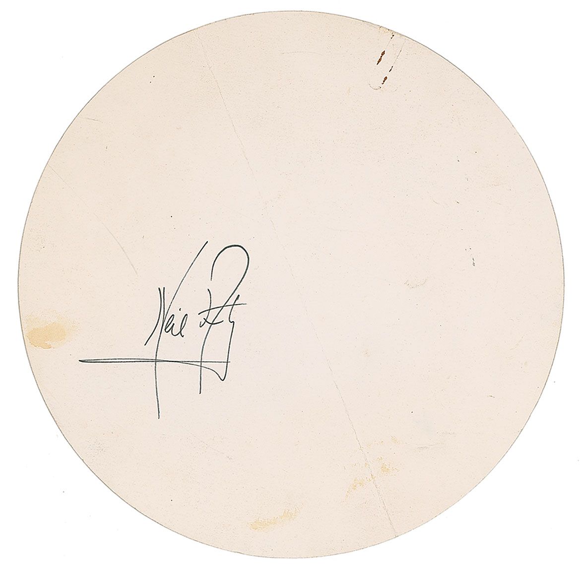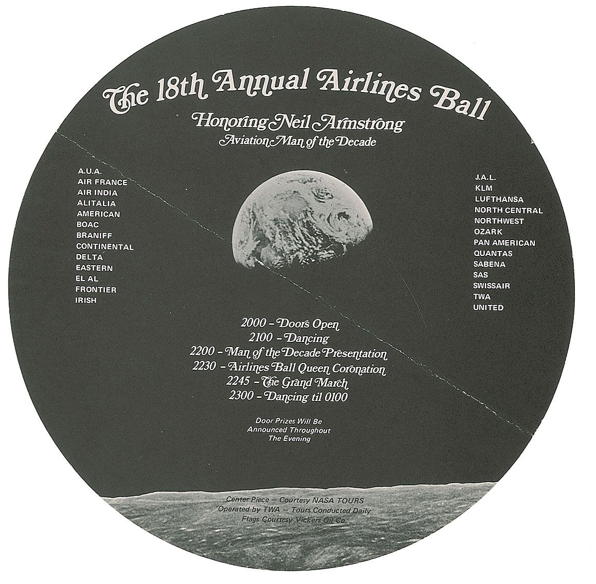 Circular one-sided cardstock program for the 18th Annual Airlines Ball held in October 1970 to honor Neil Armstrong as ‘Aviation Man of the Decade,’ measuring 8? in diameter, signed on the reverse in black felt tip by Armstrong. A noticeable central fold and a few small stains to reverse edges, otherwise fine condition.