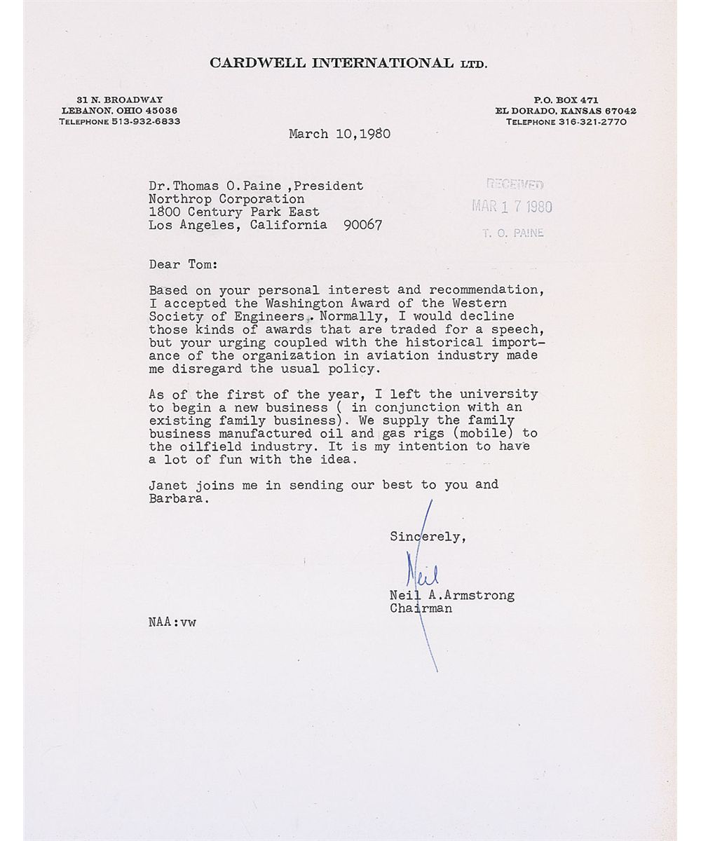 TLS signed “Neil,” one page, 8.5 x 11, Cardwell International Ltd. letterhead, March 10, 1980. Letter to Thomas O. Paine, President of Northrup. In full: "Based on your personal interest and recommendation, I accepted the Washington Award of the Western Society of Engineers. Normally, I would decline those kinds of awards that are traded for a speech, but your urging coupled with the historical importance of the organization in aviation industry made me disregard the usual policy. As of the first of the year, I left the university to begin a new business (in conjunction with an existing family business). We supply the family business manufactured oil and gas rigs (mobile) to the oilfield industry. It is my intention to have a lot of fun with the idea. Janet joins me in sending our best to you and Barbara." In fine condition, with a light office stamp to top right. Paine had been the NASA administrator in 1969-1970, including the period of Armstrong's Apollo 11 mission. A rare letter of acceptance from Armstrong, as he regularly shunned the public spotlight.