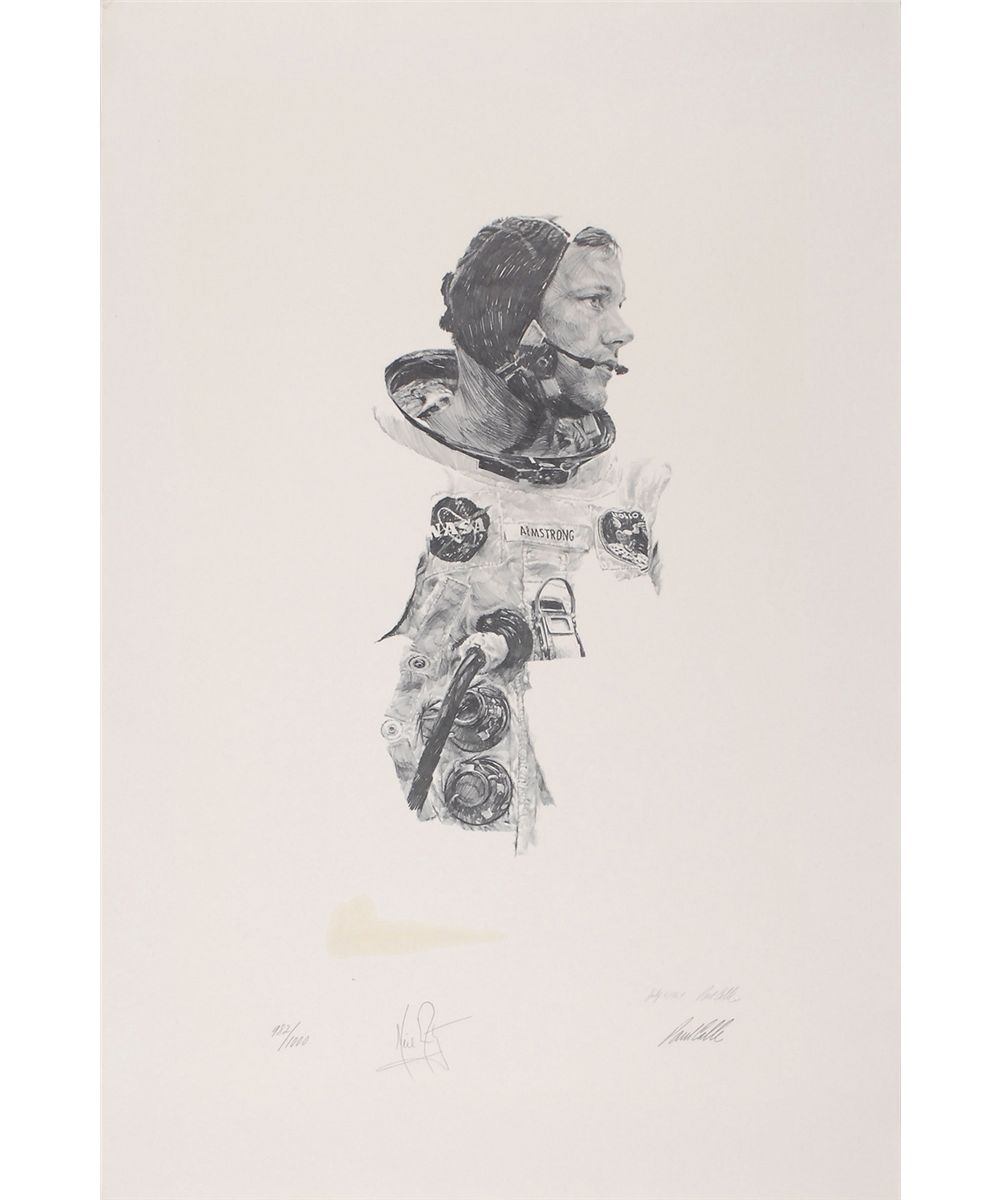 Limited edition 19 x 29 lithograph of Armstrong in his flight suit prior to the Apollo 11 mission, numbered 982/1000, signed in pencil at the National Air and Space Museum in 1976. Also signed in pencil by the artist, Paul Calle, beneath his pre-printed signature. A small area of light staining between Armstrong’s signature and image, otherwise fine condition. Accompanied by an original 19 x 29 presentation folder, with an affixed printed title, “Neil Armstrong by Paul Calle” (folder originally held a James Doolittle litho) and “National Air and Space Museum for the Charles A. Lindbergh Memorial Fund.” Also present is the rare 19 x 10 printed description picturing a photograph captioned “Paul Calle and Neil Armstrong sign the prints at the National Air and Space Museum on December 23, 1976.” A desirable item as this is the only individual print edition that Armstrong signed.