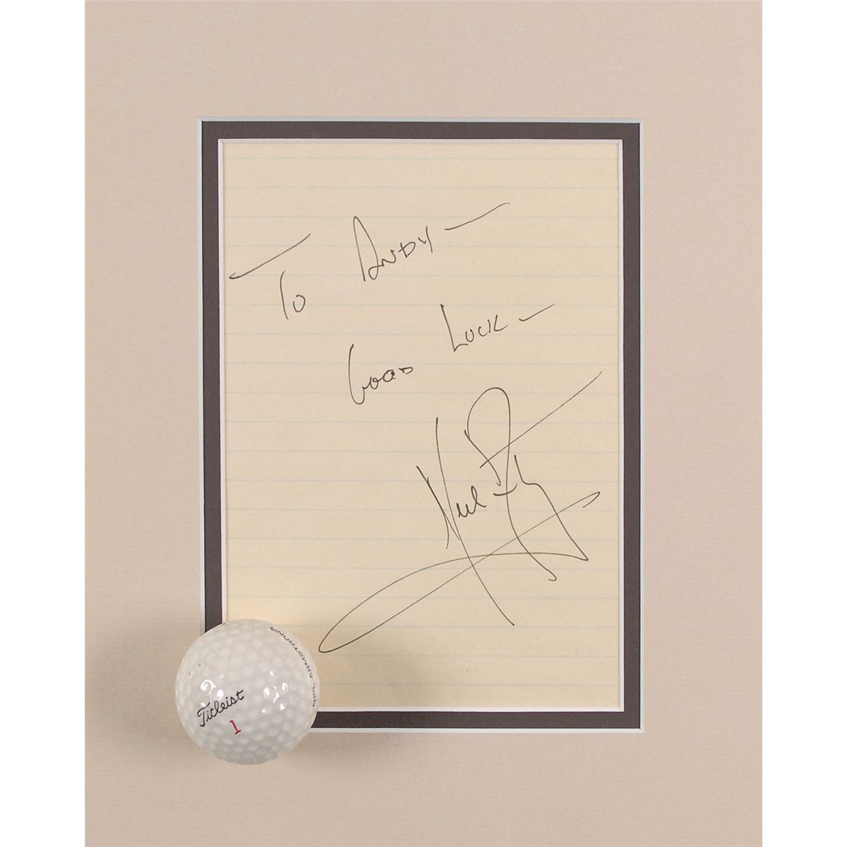 Ink signature and inscription, “To Andy—Good luck—Neil Armstrong,” on an off-white 4.5 x 6.5 lightly-lined sheet, double-matted to an overall size of 8 x 10; and a Titleist 1 Pro Trajectory 90 golf ball imprinted “Neil Armstrong.” In fine condition, with a mild shade of uniform toning to signature. Signature was obtained in the pro shop of Shaker Run Golf Course in New Lebanon, Ohio, before a round of golf. The ball was found by the same recipient a few weeks later, after hitting an errant shot into the weeds on the par-five first hole.