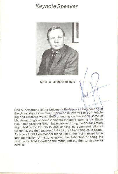 Program from the Sam Houston Area Council Boy Scouts of America 1978 Volunteer Recognition Dinner, held on May 22, 1978, at the Galleria Plaza Hotel, signed inside on his full-page image and biography in blue ballpoint. Armstrong was present as the keynote speaker. Light toning and foxing to covers and mild handling wear, otherwise fine condition.