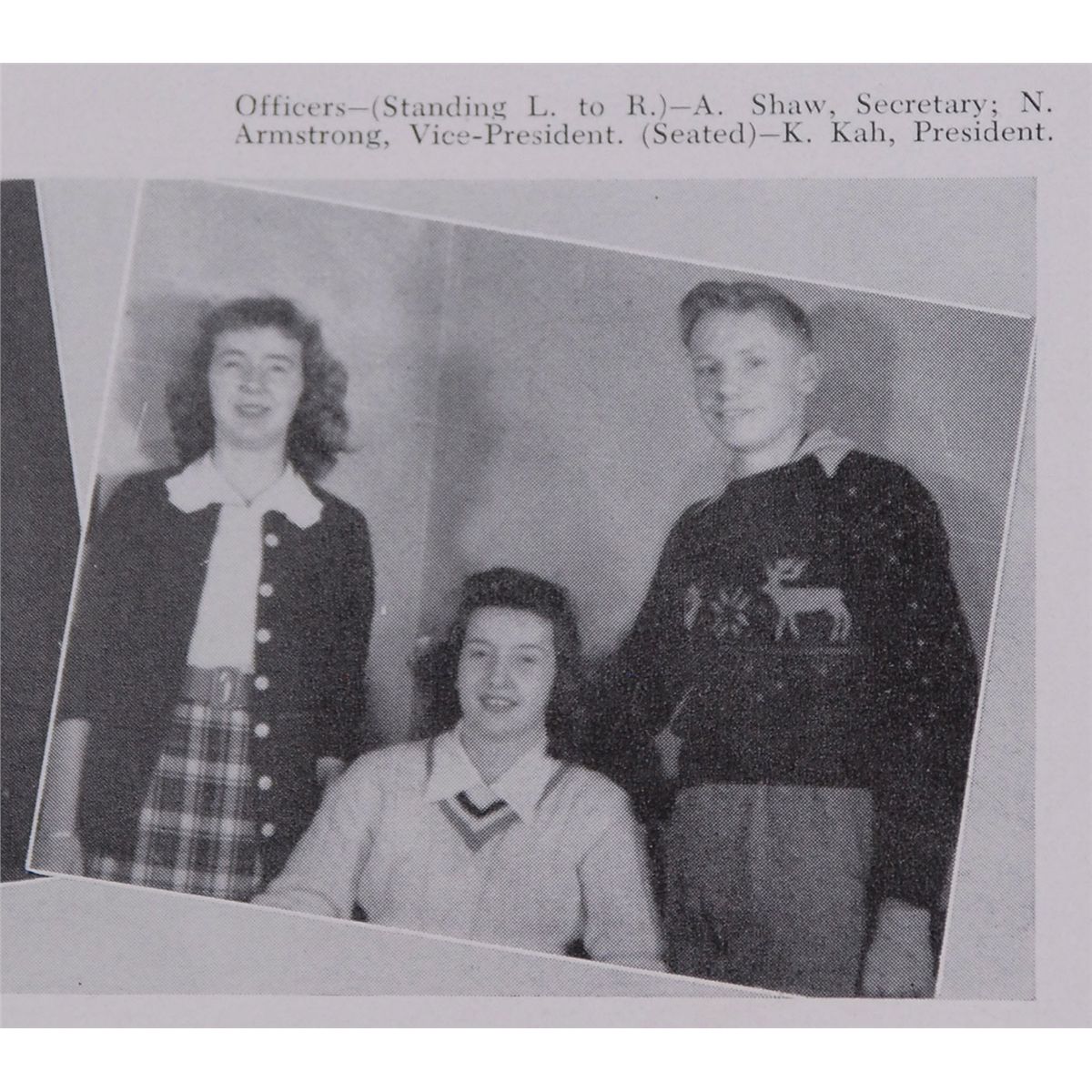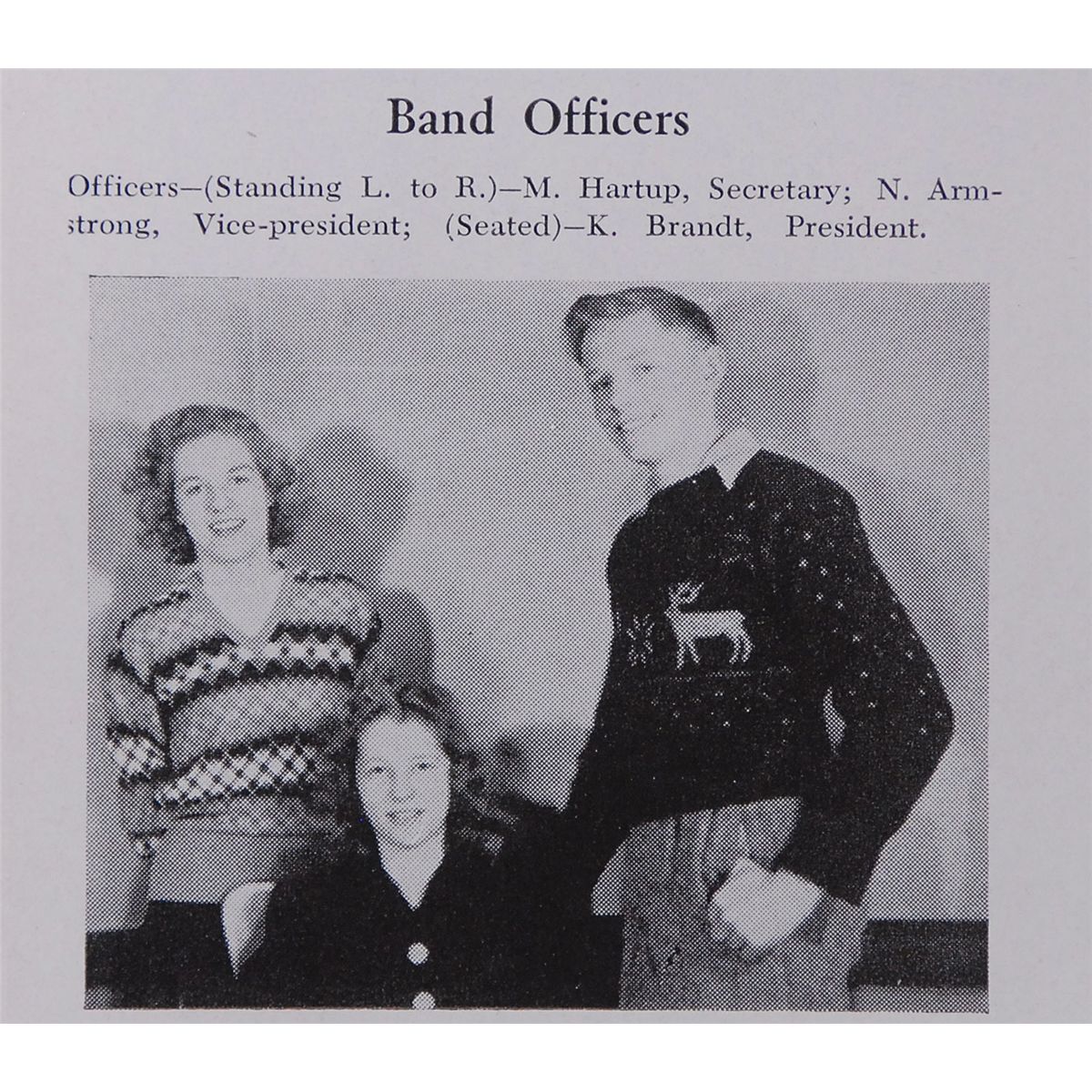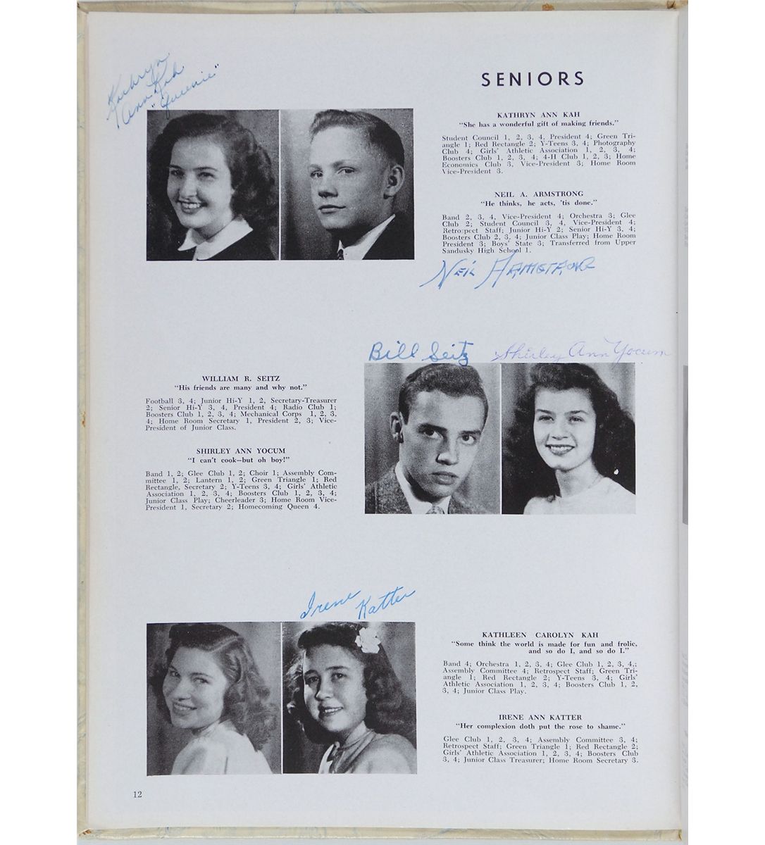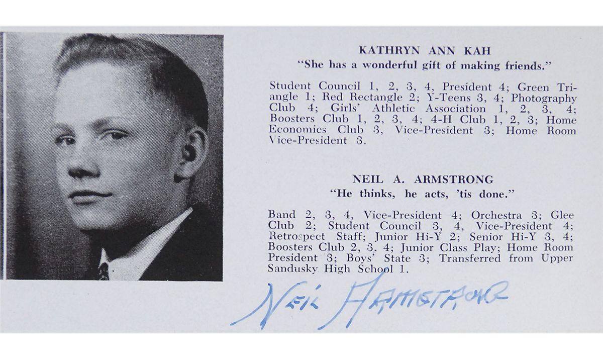 The Retrospect yearbook, dating from Armstrong’s senior year at Blume High School in Wapakoneta, Ohio, in 1947, hardcover, 8 x 11, 88 pages. Armstrong’s senior portrait is at the top of page 12; he has signed in ink under his activities, “Neil Armstrong.” Among the activities he participated in during his three years at school are “Band (2,3,4), Vice-President 4,” and “Student Council 3,4.” Armstrong is pictured an additional six times in the yearbook, twice in the band (once with the other officers), twice for Student Council (once with the other officers), and twice with the Senior Hi–Y, whose information reads, in part: “Clean Living–self-discipline in everyday life, Clean Speech–decency in conversation, Clean Scholarship–honesty in school, Clean Sportmanship–fairness in athletics.” In fine condition, with light soiling to covers. Accompanied by a full letter of authenticity from JSA. Armstrong’s dedication to such creeds as those endorsed by the Senior Hi–Y, including “clean living,” “self-discipline,” and “decency,” would go on to serve him well in life—especially in the Apollo 11 moon landing and the demands of a post-NASA life as a living legend.