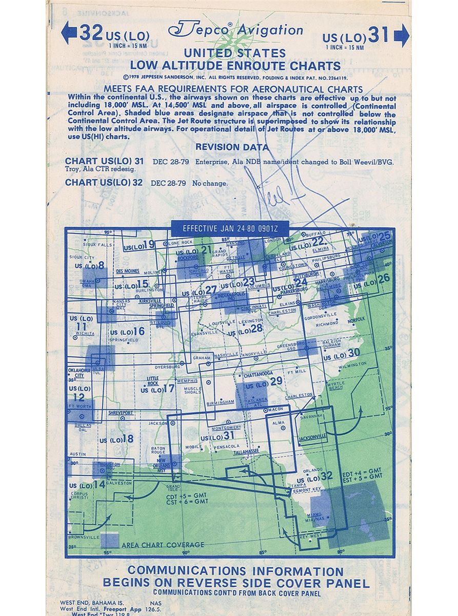 Folded instrument navigation chart, 5 x 8.5, which opens to a size of 34.75 x 16.75, entitled “United States Low Altitude Enroute Charts…Effective Jan 24-80,” carried on board a corporate flight carrying Armstrong from Chicago to West Palm Beach, signed on the front in blue ballpoint by Armstrong. Signature was acquired by the plane’s first officer Michael Wright and is accompanied by a typed statement of authenticity which reads, in part: “I served as First Officer of a corporate aviation flight conducted by Beckett Aviation of Cleveland, Ohio…The Chief Executive Officer of White Motor was ‘Bunkie’ Knudsen. He invited Mr. and Mrs. Neil Armstrong to be his guests on a flight that originated at Cleveland, proceeded to Pontiac, Michigan and Chicago O’Hare before terminating in West Palm Beach, Florida. Mr. and Mrs. Armstrong boarded the aircraft at Chicago O’Hare…Our crew scheduler / dispatcher, Greg Nemetz asked that I obtain Neil Armstrong’s autograph for him. The only paper immediately available in the cockpit was an instrument navigation chart and that is what Mr. Armstrong signed.” Also included is a photocopy of Wright’s logbook page for the flight, which notes picking up Mr. and Mrs. Armstrong. In fine condition, with expected light handling wear. A unique aviation-related item with superb provenance.